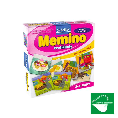 Jedinečná hra ze série MÉ PRVNÍ HRY je určena pro 1 až 4 děti od 2 do 4 let. Je založena na principu pexesa, na obrázcích vyrobených z odolného pevného kartonu jsou však vždy dvojice protikladů. Pravidla nabízejí variantu pro jedno i více dětí, které si při hře nejen rozvíjejí své logické myšlení a pozorovací schopnosti, ale procvičí si i postřeh a rychlé rozhodování. Hra, která obdržela od odborníků titul „Správná hračka“, umožní rodičům strávit s dětmi příjemné okamžiky a při společné zábavě hravou formou podpořit jejich všestranný rozvoj. Pravidla totiž lze upravit např. tak, že nejmenší děti nebo začátečníci mají všechny kartičky otočené obrázkem k sobě a pouze je párují; starší či pokročilejší hráči už mají polovinu karet otočenou obrázkem dolů a začínají trénovat i paměť. Hra tak s dětmi „roste“ a přizpůsobuje se rozvoji jejich schopností.