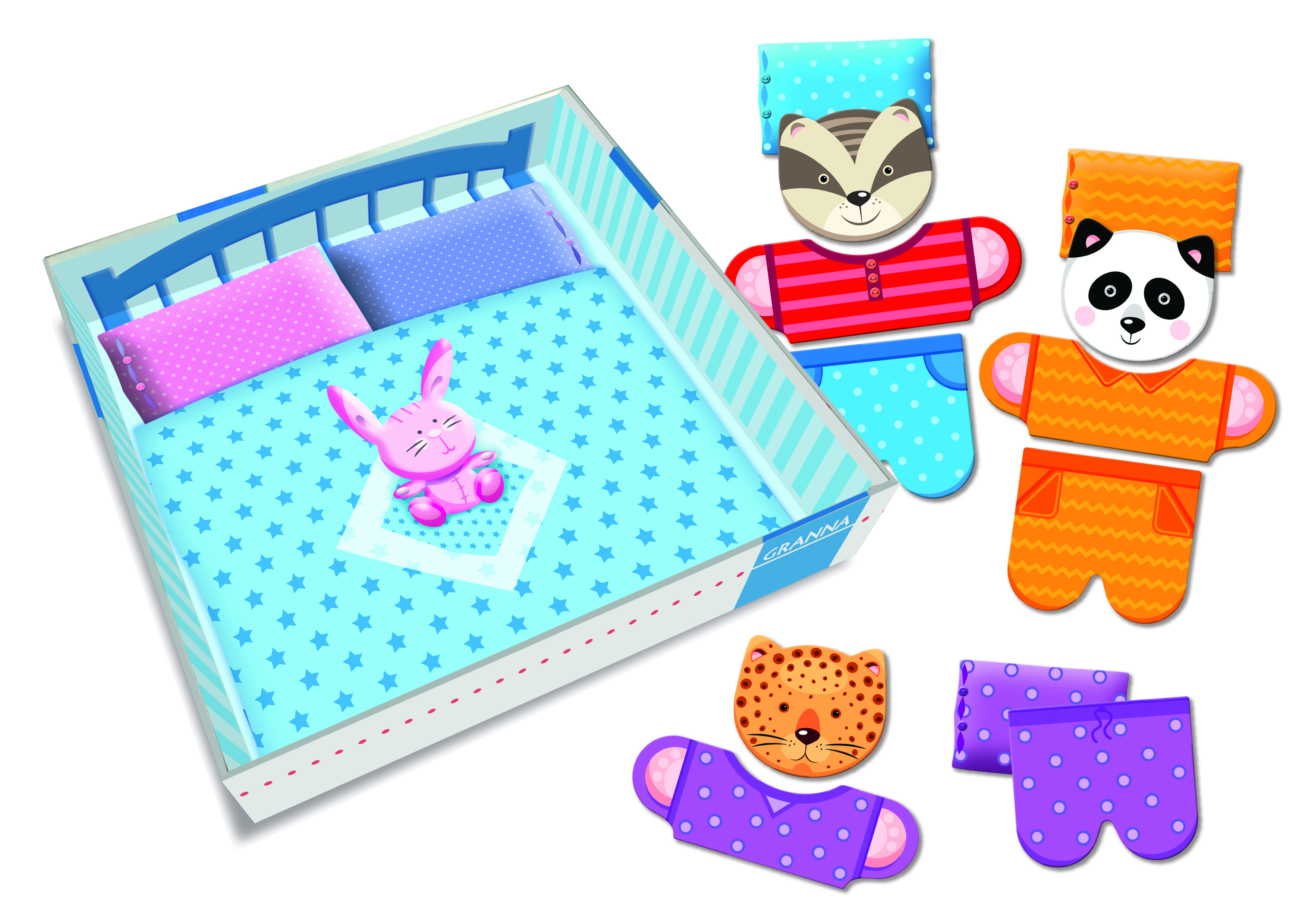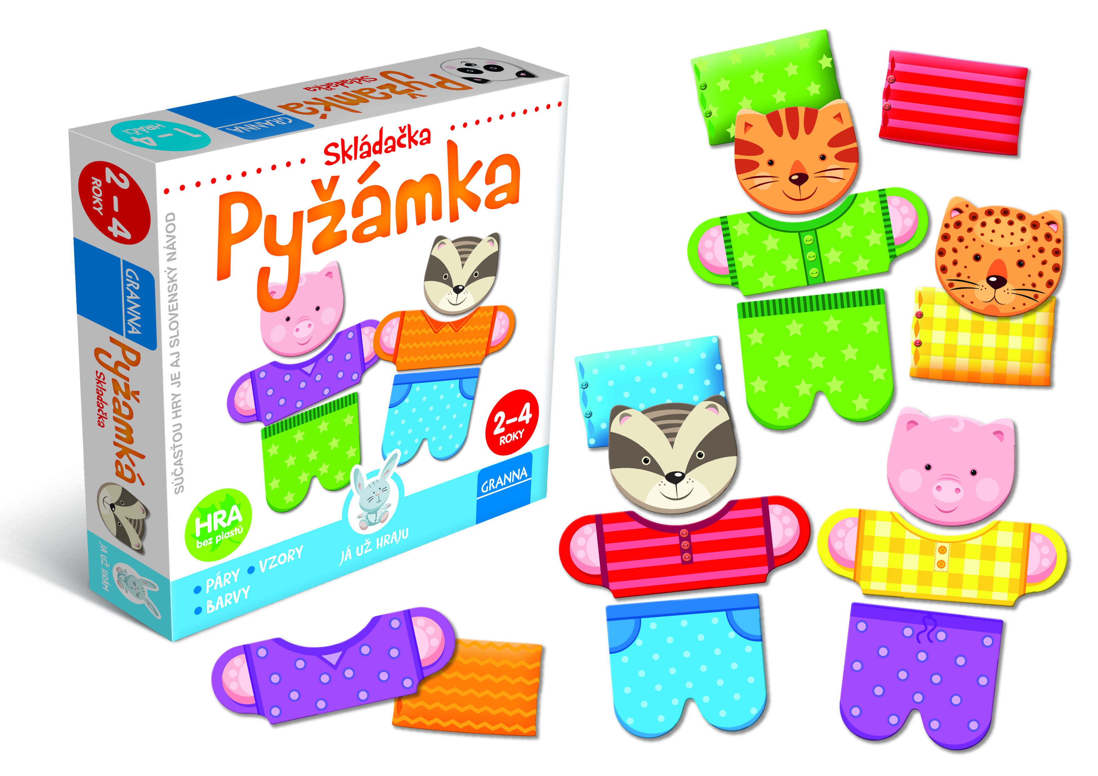 Pyžámka jsou skládačka a hra v jednom pro děti od 2 do 4 let. Děti si při oblékání a ukládání zvířátek ke spánku procvičí postřeh, koncentraci, motoriku, barvy a estetické cítění. Pyžámka lze hrát jako paměťové pexeso na dobrou noc nebo postřehovou a zručnostní skládačku pro více dětí najednou.