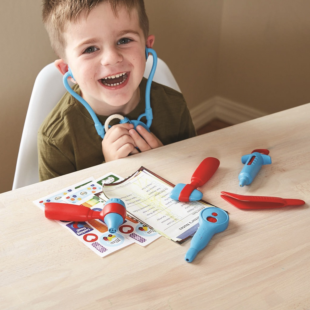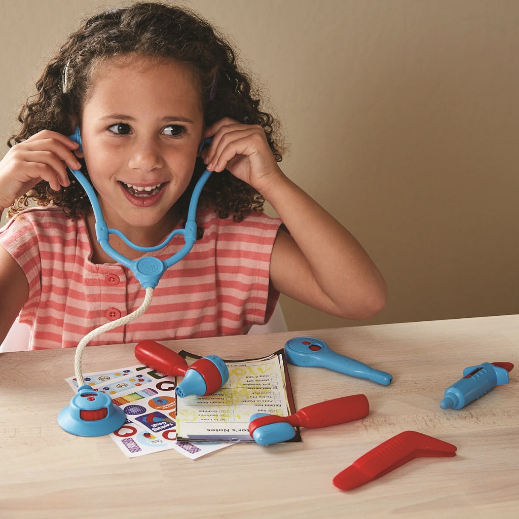 K vyléčení pacienta mají lékařky k dispozici šest nástrojů, mohou si také zapsat diagnostické poznámky. Srdce poslechnou stetoskopem, teplotu změří teploměrem a otoskopem se zase podívají do uší. Tato hračka děti podpoří v kreativní a představivé hře na role, pomůže jim porozumět postupu u lékaře, což se bude hodit při vlastních návštěvách. Také rozvíjí sociální a jazykové dovednosti, děti budou mluvit se svými pacienty o jejich zdraví. Naučí starat o druhé a rozvinou svou empatii. Hračka je bezpečná, netoxická, neobsahuje BPA, PVC, ftaláty, ani vnější nátěr.