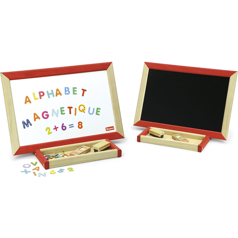 Stolní oboustranná magnetická tabule s dřevěnou základnou vybavenou odkládacím či úložným prostorem. Na černou tabuli se píše a kreslí křídou, bílou tabuli lze popisovat zvlášť určenými fixy a mazat plstěnou houbičkou. Vyrobeno ve Francii, z masivního bukového a borovicového dřeva francouzského původu. Součásti jsou ošetřeny výhradně za použití barev a laků na bázi vody. Baleno v kartonu potištěném rostlinnými inkousty. Součástí balení jsou křídy, houbička a sada vzorovaných magnetických písmen.