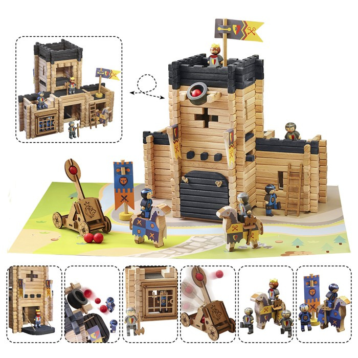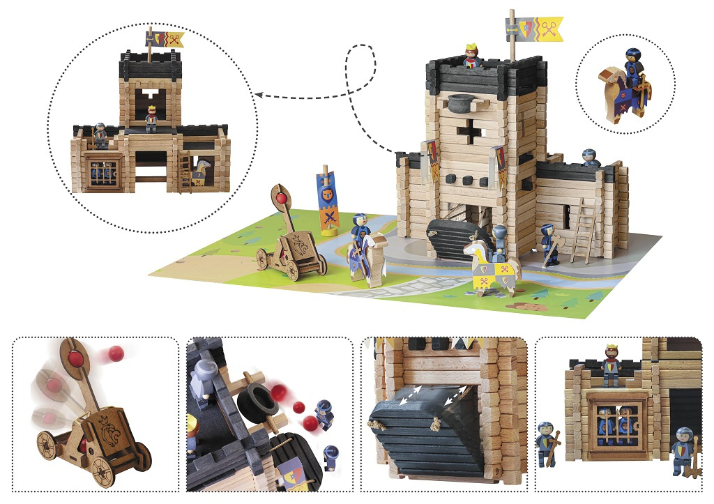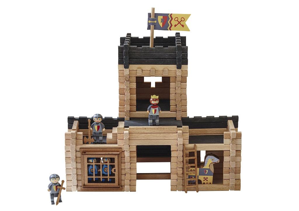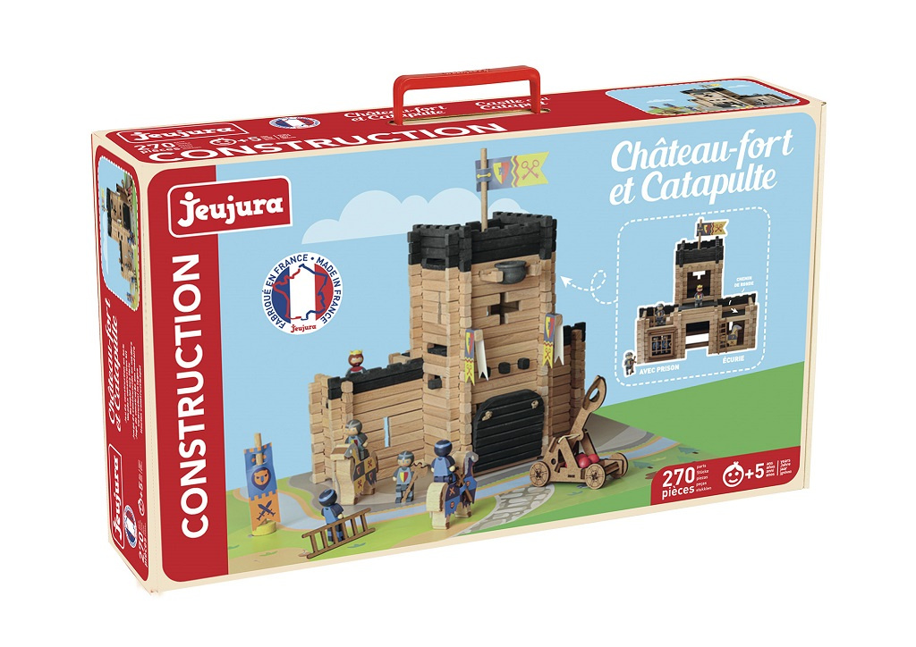 Zažijte velká dobrodružství s těmito chrabrými rytíři! Postavte si svůj vlastní hrad, nainstaluje padací most, vězení, strážní stezku, vlajky a sestavte katapult. Stačí nasednout na koně a dobývání může být zahájeno! Stavebnice Jeujura Constructions mají dlouhou tradici a patří mezi klasické francouzské hračky. Nabízí série tématicky věnované chatám, domkům a farmám, ale také divokému západu a středověku. Dají se mezi sebou volně kombinovat a k řadě z nich je také nabízeno příslušenství, figurky a vozidla. Jsou vyráběny ve Francii, z masivního bukového a borovicového dřeva francouzského původu. Dílky jsou ošetřeny výhradně za použití barev a laků na bázi vody. Každá sada je balena v praktickém lepenkovém kufříku potištěném rostlinnými inkousty a součástí balení je snadno pochopitelný návod.