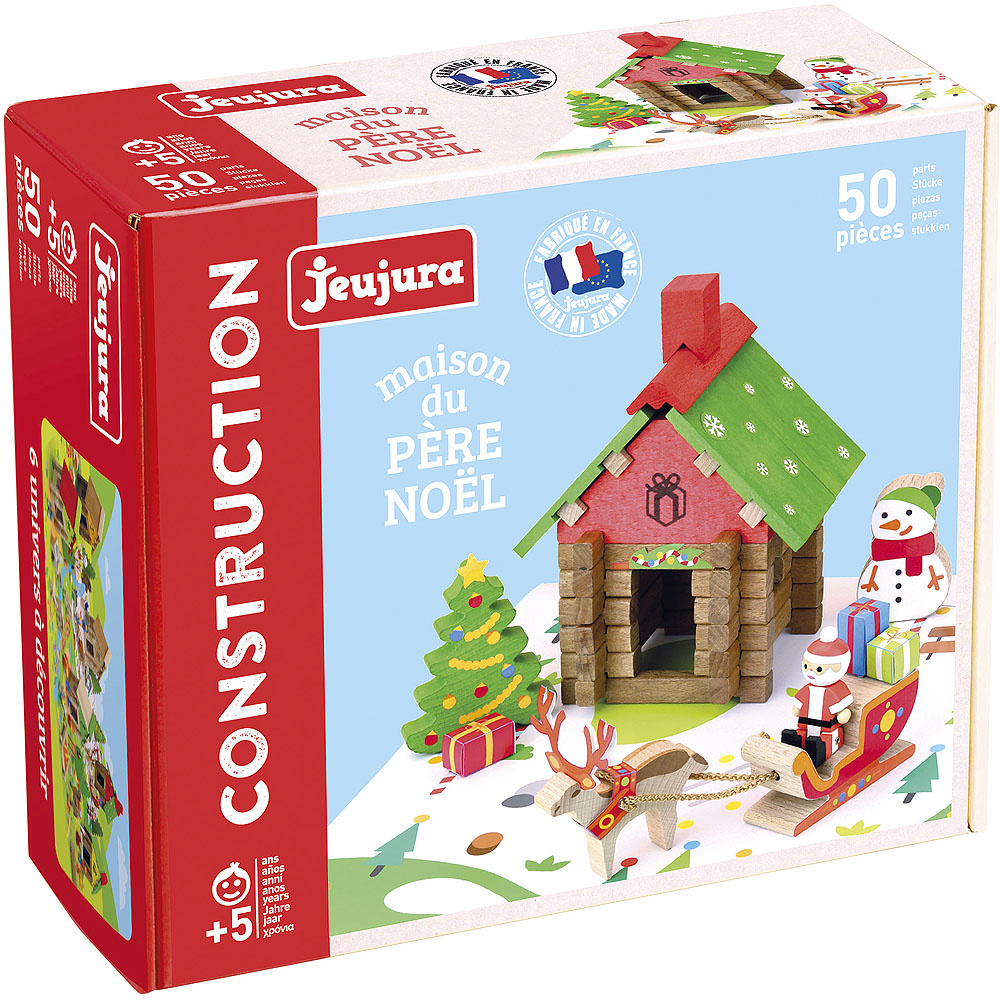 Dřevěná stavebnice s domečkem a spřežením Santy Clause rozvíjí fantazii a stane se ozdobou dětského pokoje. Stavebnice Jeujura Constructions mají dlouhou tradici a patří mezi klasické francouzské hračky. Nabízí série tématicky věnované chatám, domkům a farmám, ale také divokému západu a středověku. Dají se mezi sebou volně kombinovat a k řadě z nich je také nabízeno příslušenství, figurky a vozidla. Jsou vyráběny ve Francii, z masivního bukového a borovicového dřeva francouzského původu. Dílky jsou ošetřeny výhradně za použití barev a laků na bázi vody. Každá sada je balena v praktickém lepenkovém kufříku potištěném rostlinnými inkousty a součástí balení je snadno pochopitelný návod.