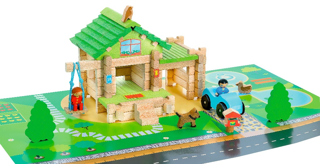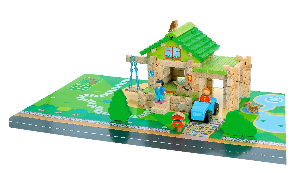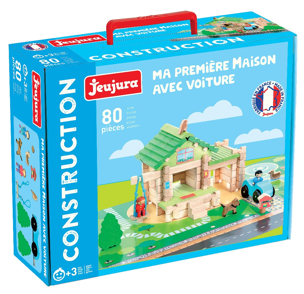 Dřevěná stavebnice domečku s autem k hrám s figurkami rodin rozvíjí fantazii a stane se ozdobou dětského pokoje. Stavebnice Jeujura Constructions mají dlouhou tradici a patří mezi klasické francouzské hračky. Nabízí série tématicky věnované chatám, domkům a farmám, ale také divokému západu a středověku. Dají se mezi sebou volně kombinovat a k řadě z nich je také nabízeno příslušenství, figurky a vozidla. Jsou vyráběny ve Francii, z masivního bukového a borovicového dřeva francouzského původu. Dílky stavebnic jsou ošetřeny výhradně za použití barev a laků na bázi vody. Každá sada je balena v praktickém lepenkovém kufříku potištěném rostlinnými inkousty a součástí balení je snadno pochopitelný návod.