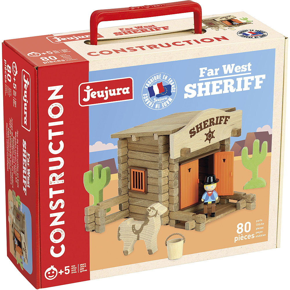 Dřevěná stavebnice s kulisami divokého západu se stane ozdobou dětského pokoje. Stavebnice Jeujura Constructions mají dlouhou tradici a patří mezi klasické francouzské hračky. Nabízí série tématicky věnované chatám, domkům a farmám, ale také divokému západu a středověku. Dají se mezi sebou volně kombinovat a k řadě z nich je také nabízeno příslušenství, figurky a vozidla. Jsou vyráběny ve Francii, z masivního bukového a borovicového dřeva francouzského původu. Dílky jsou ošetřeny výhradně za použití barev a laků na bázi vody. Každá sada je balena v praktickém lepenkovém kufříku potištěném rostlinnými inkousty a součástí balení je snadno pochopitelný návod.