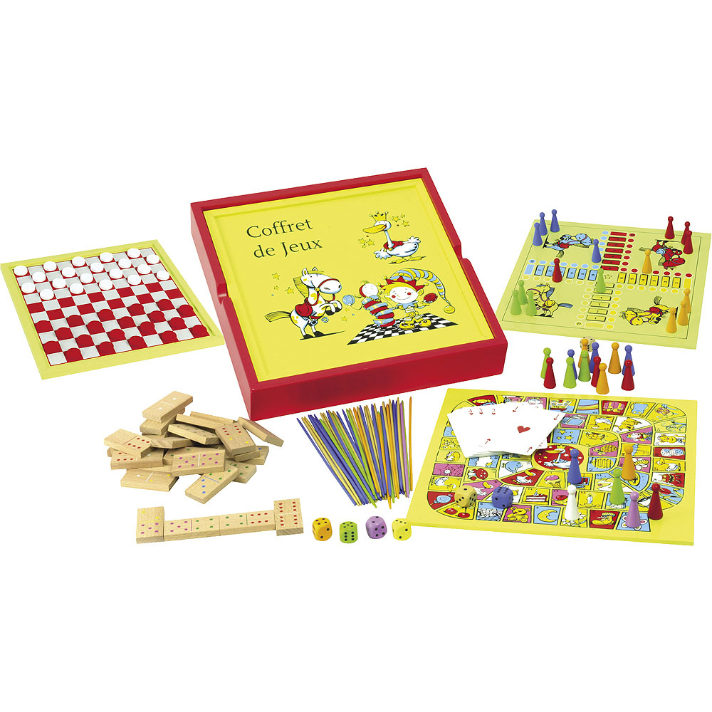 Soubor stolních, deskových her a karet v atraktivním a praktickém provedení. Obsahuje dámu, mlýn, husu, hady a žebříky i člověče nezlob se. Součástí je také mikádo, domino a balíček bridžových karet. Baleno v robustním boxu z masivního dřeva.