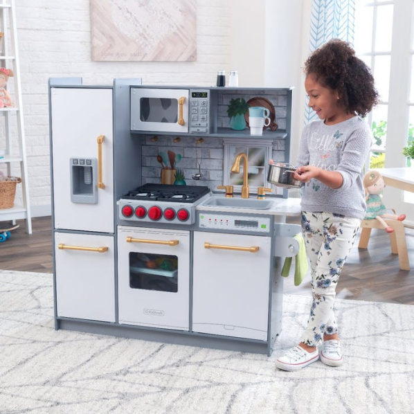 Rozměry: 98x35x102 cm Rozměry balení: 115x41x18cm Věk: 3+ Materiál: MDF, plastové doplňky, kov Napájení: (AAA) baterie, nejsou součástí balení Ultra moderní a inovativní kuchyňka KidKraft Uptown Elite v elegantních barvách, vytváří skvělou zábavu pro začínající kuchaře! Krásné detaily a mnoho funkcí kuchyňky pomohou dětem stále něco objevovat a inspirují je k dalším hrám. Kuchyňka obsahuje: varnou desku a roštem se světelnými a zvukovými efekty mikrovlnou troubu se zvuky kombinovanou lednici s funkčním výrobníkem ledu odjímatelný dřez s baterií - myčku nádobí troubu ovládanou knoflíky se zvukovým efektem horní polici - háčky na uložení příslušenství a závěsnou tyč na ručníky Kuchyňka nabízí dostatek prostoru pro hru a může si zde hrát více dětí najednou. Inovativní technologie EZ Kraft Assembly ™ urychluje montáž. , ,