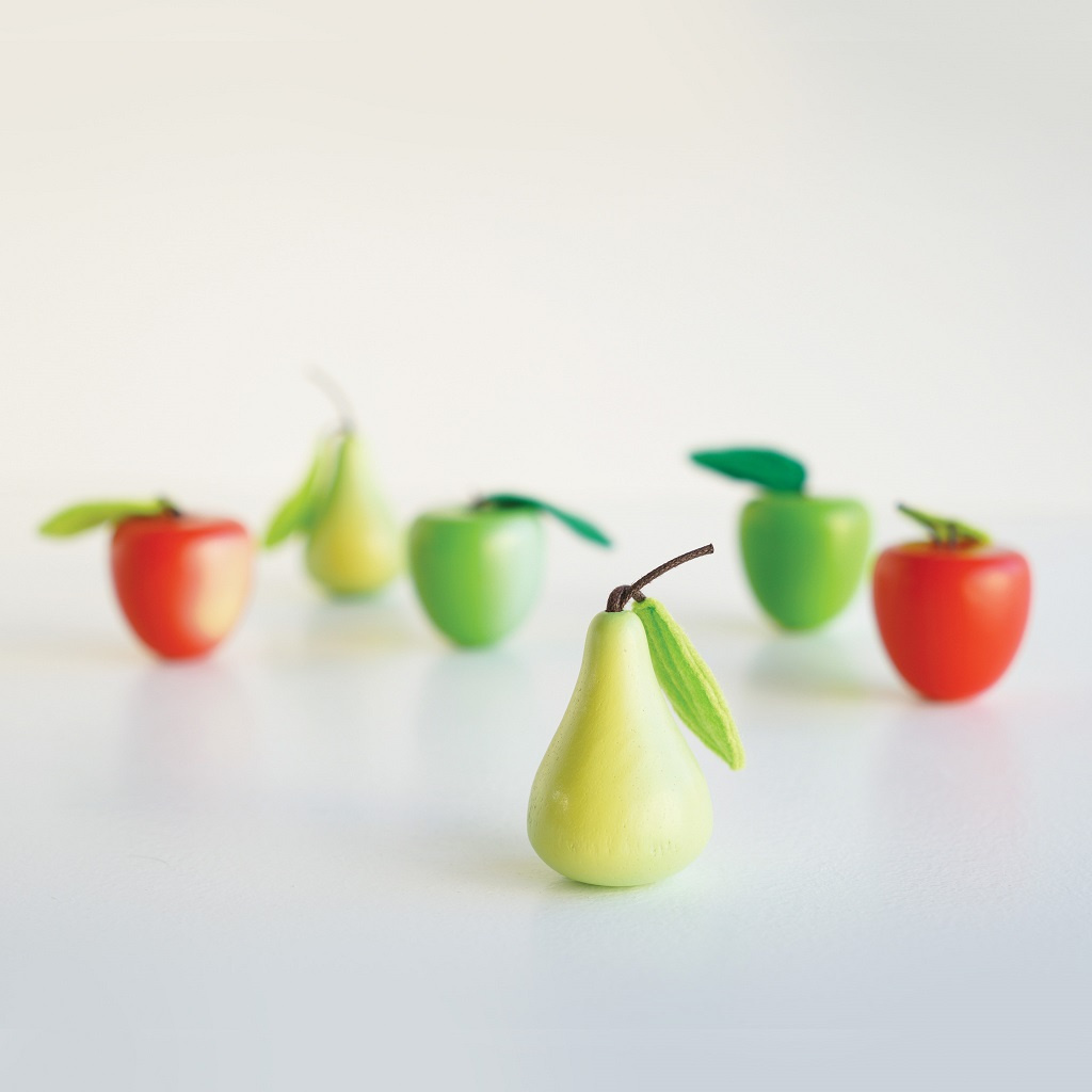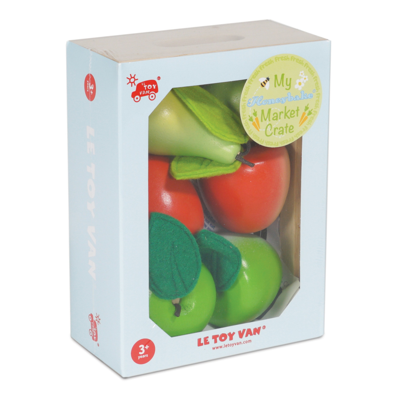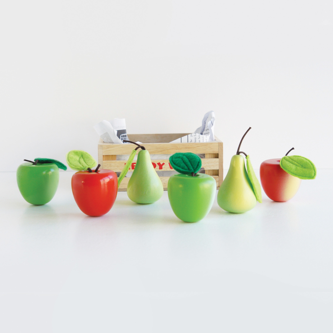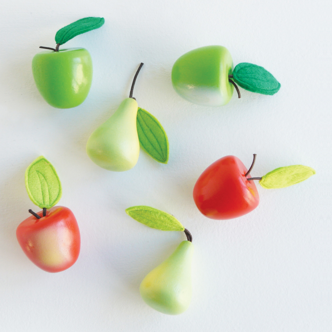 Užijte si den na trhu, kupte si bedýnku ovoce a popusťte uzdu své představivosti. Dřevěná jablka a hrušky, čerstvé přímo z farmy! Praktická přepravka má otvory na ruce. V balení najdete dvě červená a dvě zelená jablka, dvě zelené hrušky. Ovoce má krásné plstěné stopky a vyšívané lístky.