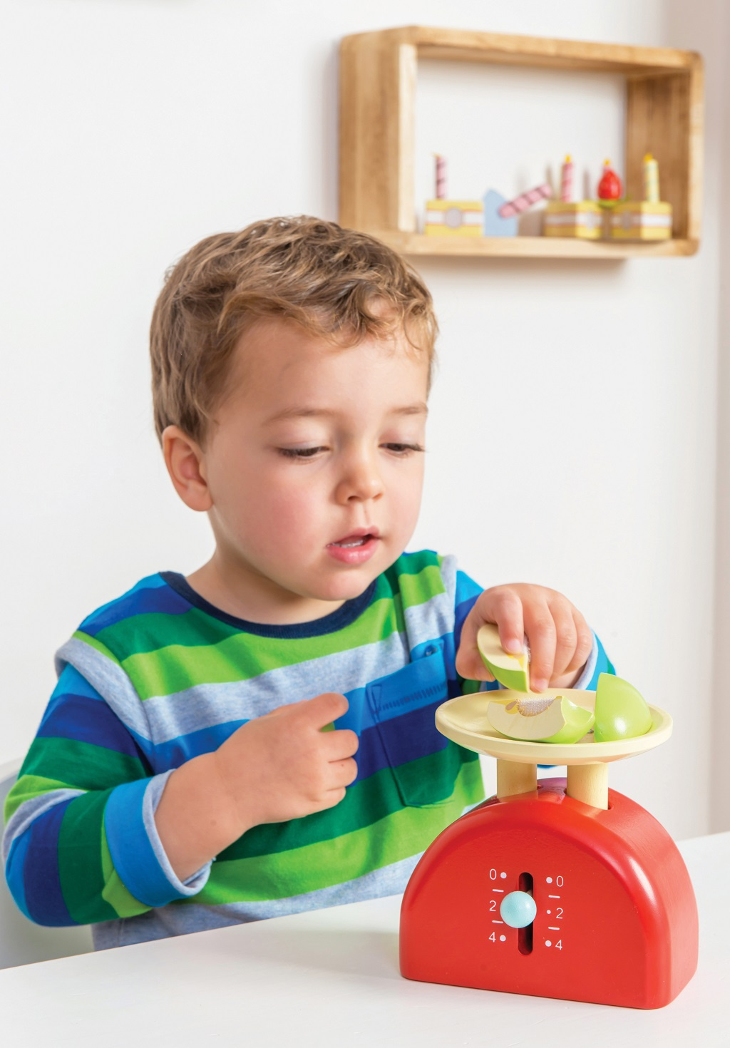 Perfektní pro mladé pekaře a šéfkuchařky! Dřevěná váha bude skvělým doplňkem dětských kuchyněk a prodejních stánků. Pestrobarevná hračka děti inspiruje k představivé hře. Je dekorována netoxickými barvami na bázi vody. Chytrá pohyblivá páčka umožňuje realistickou hru, vážení s ní bude opravdu jednoduché. Nechybí ani dvě jablka, které jsou rozpůlená. Uprostřed mají suchý zip, lze je tak jednoduše spojit i rozpojit.