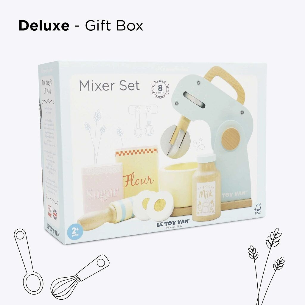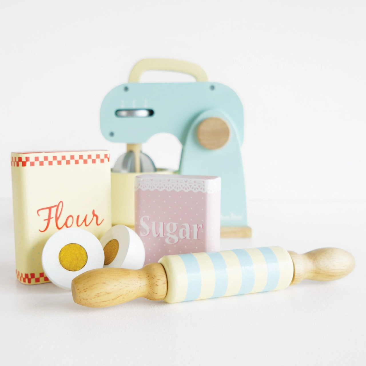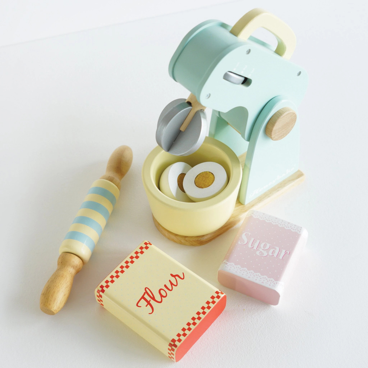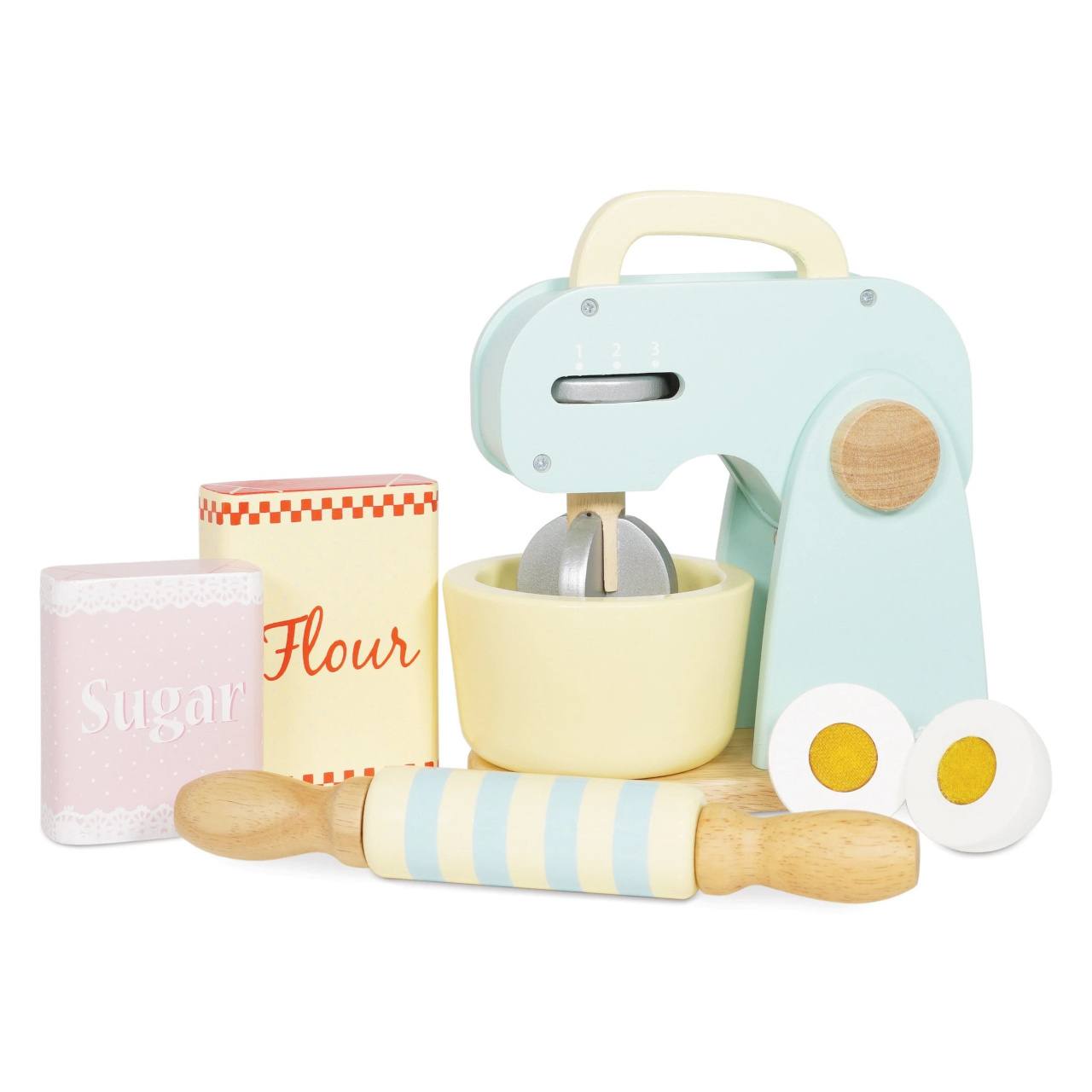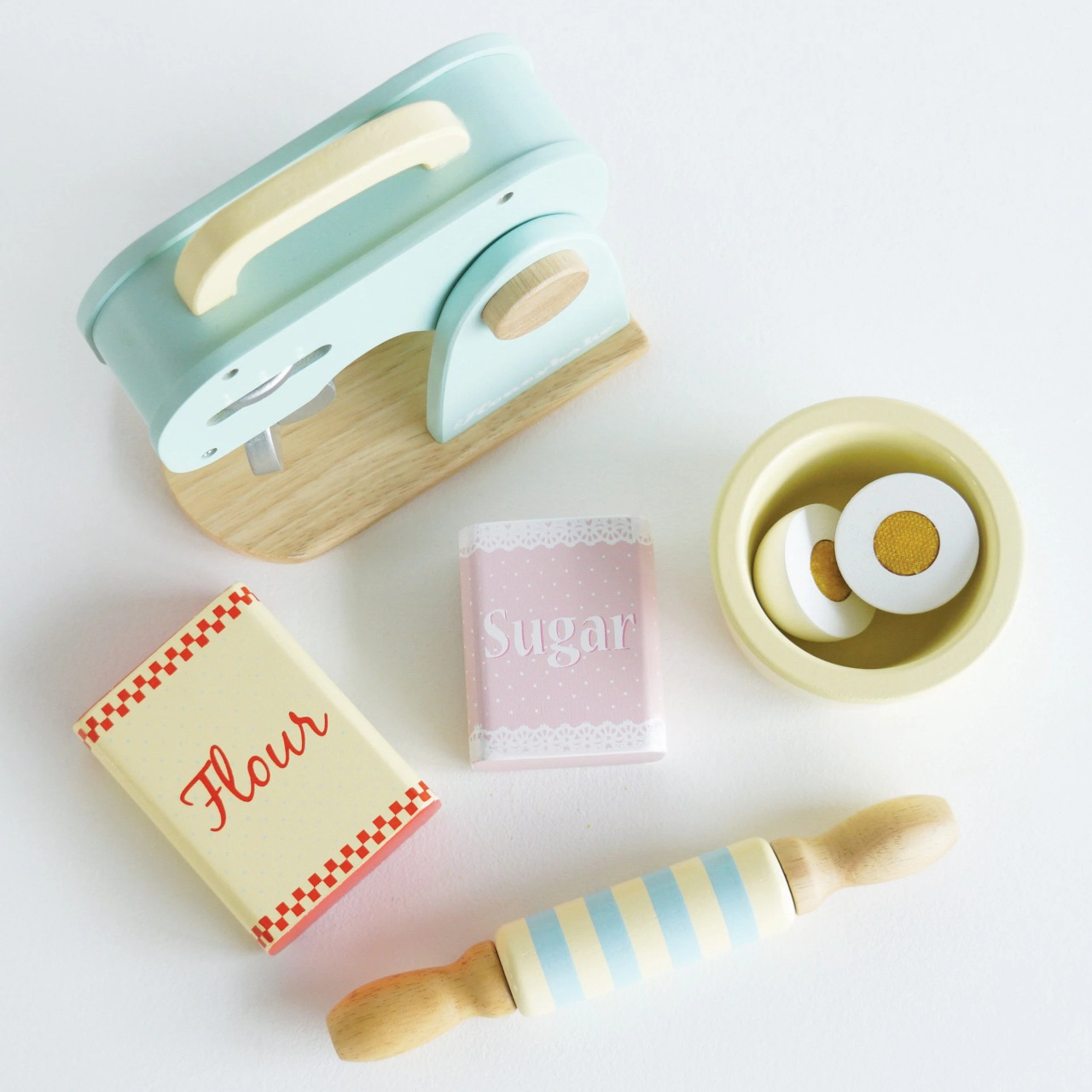 Co upečou malí pekaři a pekařky? Kuchyňský robot s příslušenstvím je připraven k představivé hře! V balení otočná metlička, dřevěný váleček a mísa. Tato krásná retro hračka je malována pastelovými barvami, nechybí ani ingredience k jejímu použití – mouka, cukr, mléko a vejce. Děti mohou „upéct“ dort, sušenky nebo buchtu ve vlastní dětské kuchyňce!