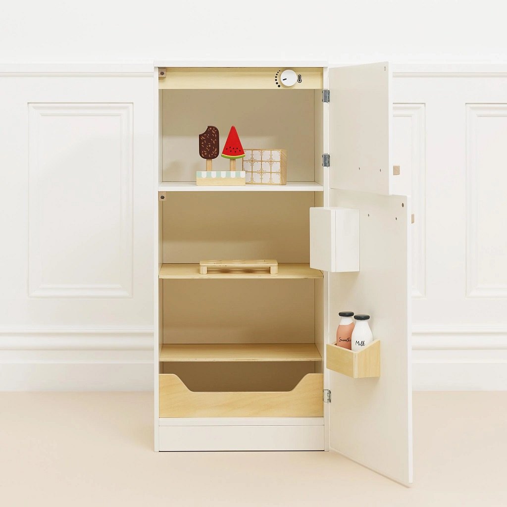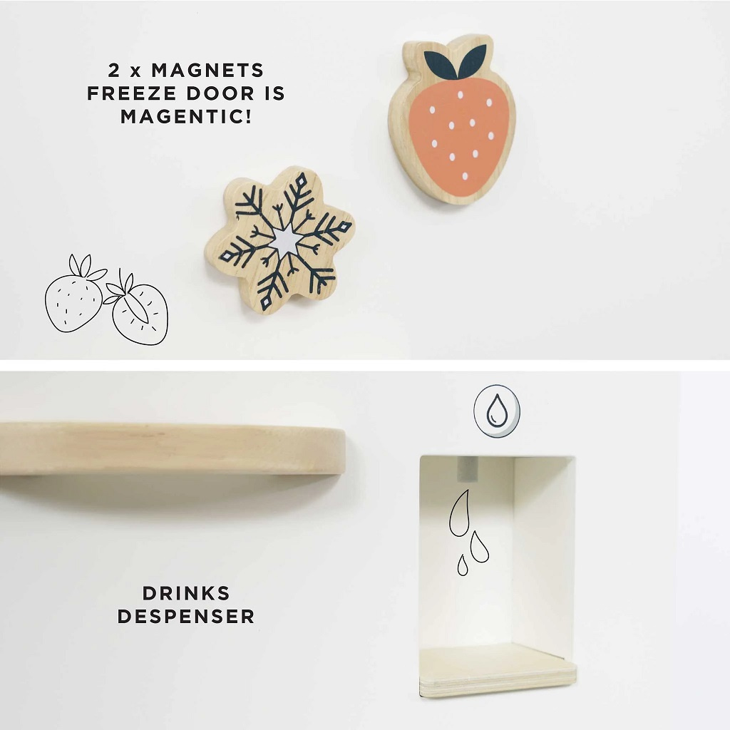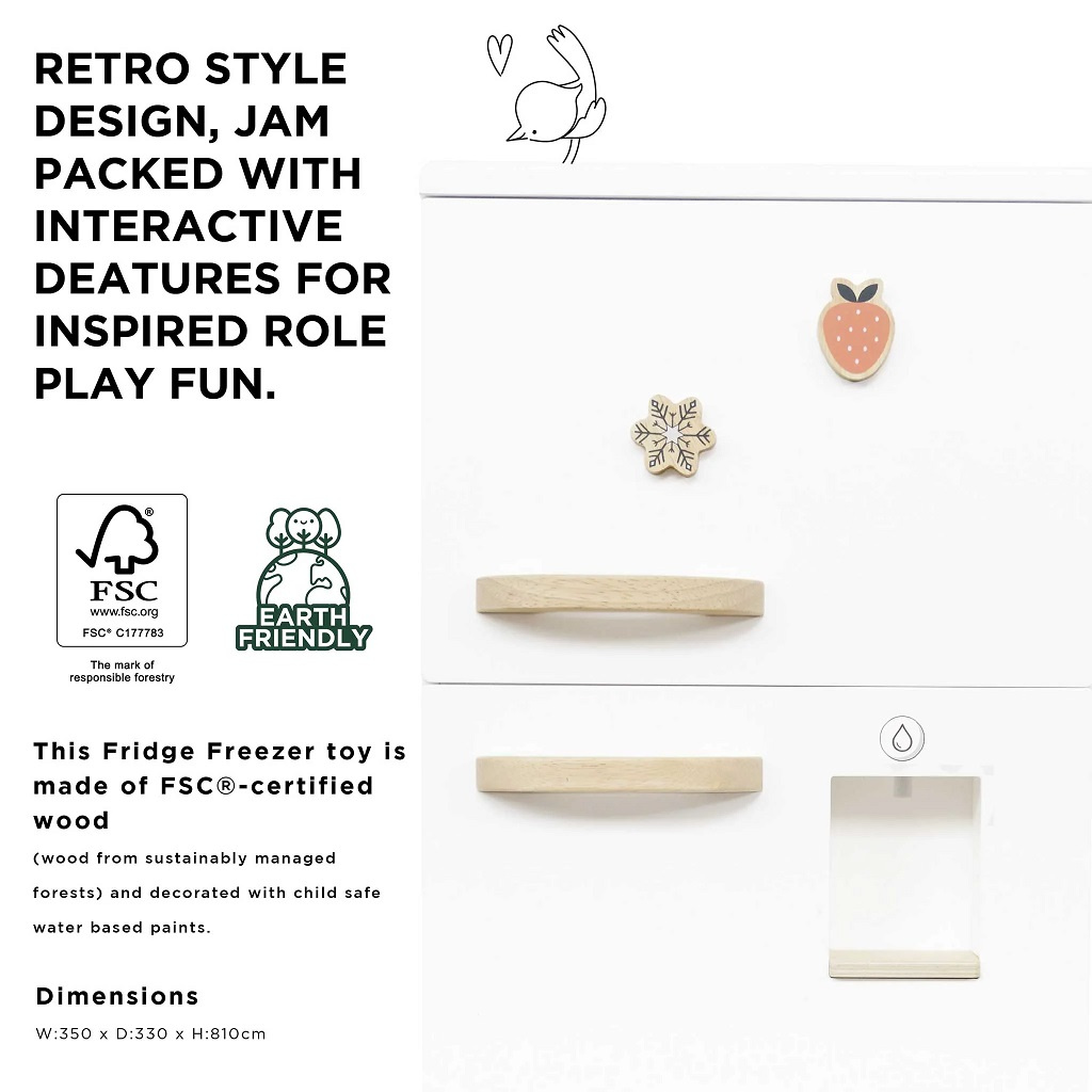 Vylepšete svou kuchyňku touto úžasnou volně stojící lednicí s mrazákem! Odolná hračka s lákavým retro designem je plná interaktivních funkcí pro větší zábavu a víc nápadité hraní rolí. Objevte vestavěný dávkovač vody, ovládání teploty či přihrádky na ovoce a zeleninu. Kompletní set přichází také s řadou příslušenství včetně 2 nanuků, stojanu, tácků na vejce a led a láhve na mléko či smoothie. Dveře ledničky jsou magnetické a navíc jsou zde dva praktické, zdobné magnety. Lednice je kompatibilní s velkou kuchyní Le Toy Van (kód TV347). Sada je vyrobena ze dřeva s certifikací FSC® (dřevo z lesů obhospodařovaných udržitelným způsobem) a zdobena barvami na vodní bázi bezpečnými pro děti.