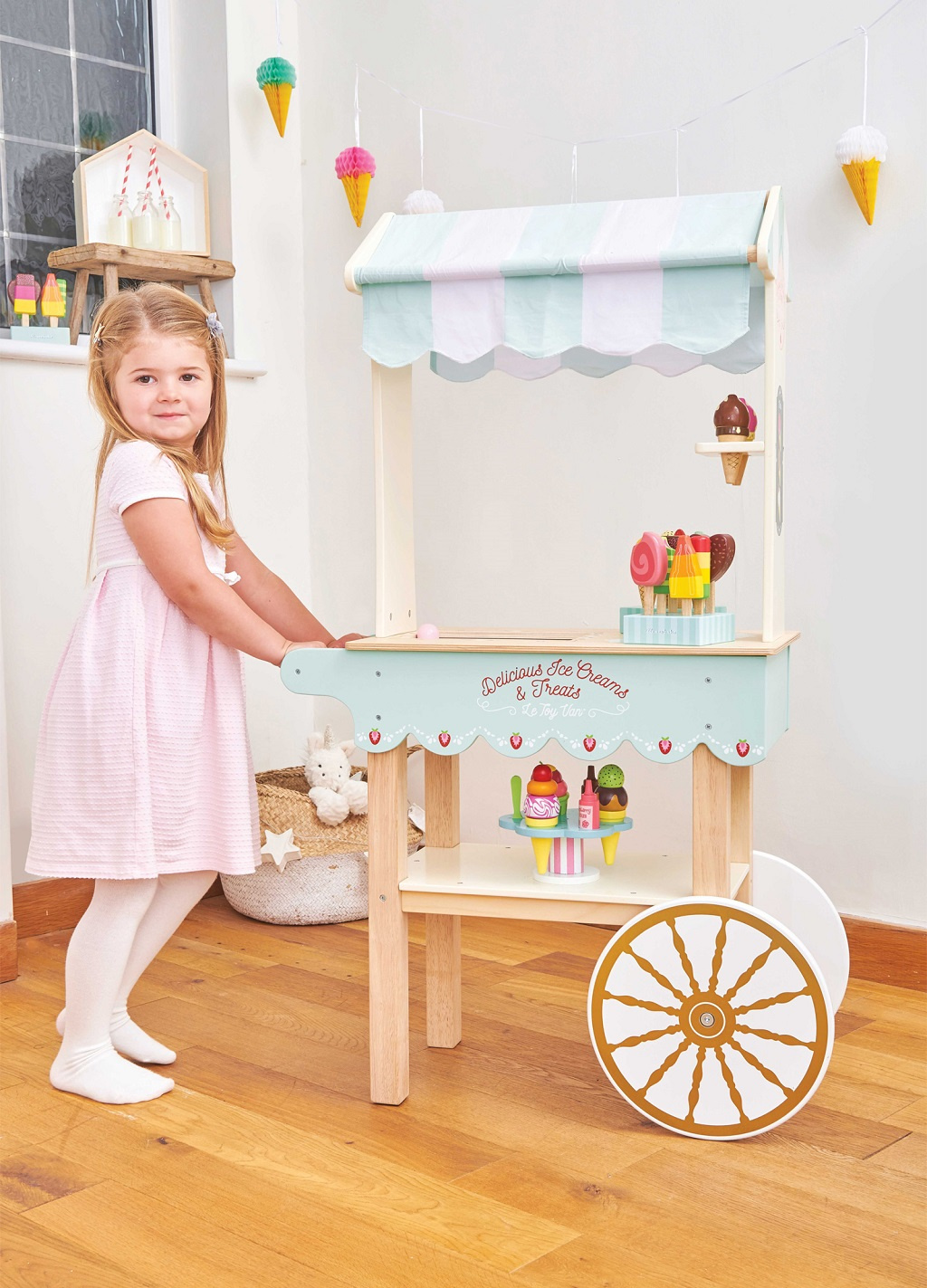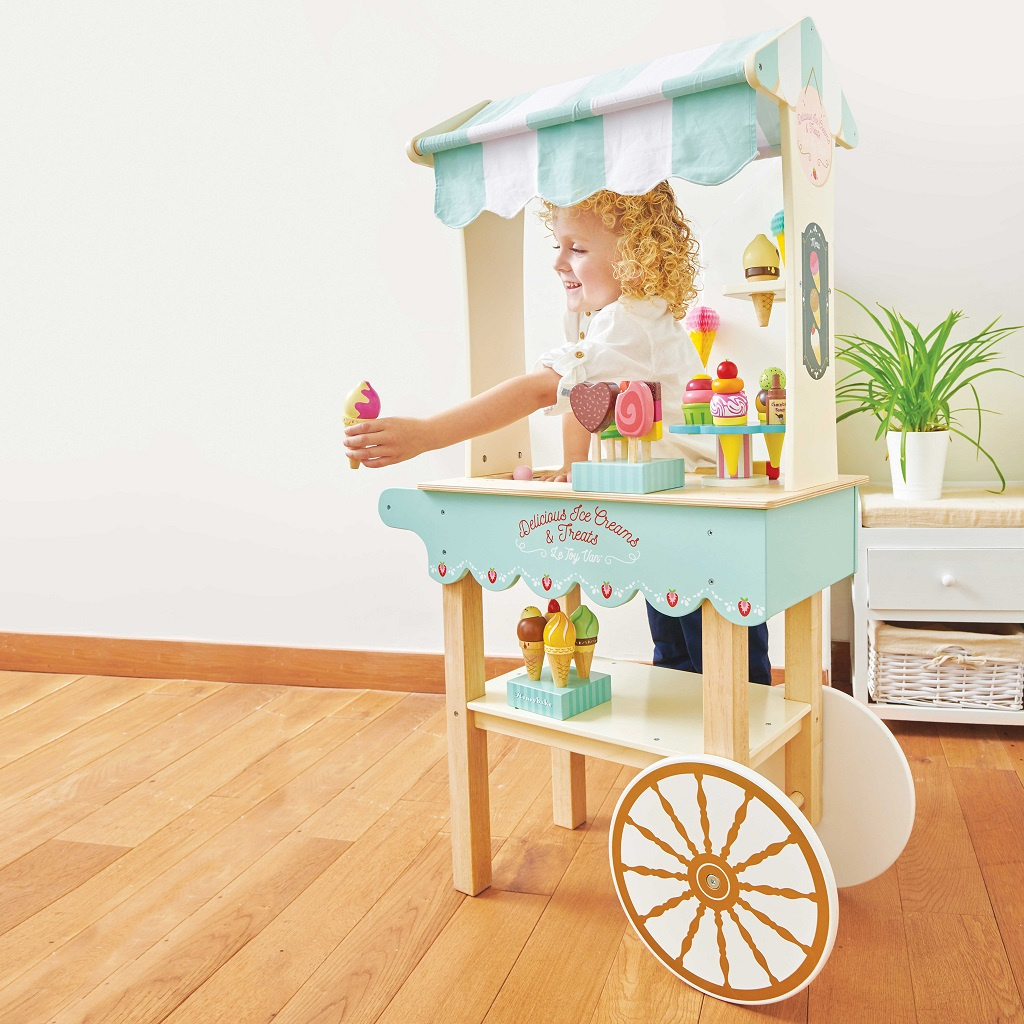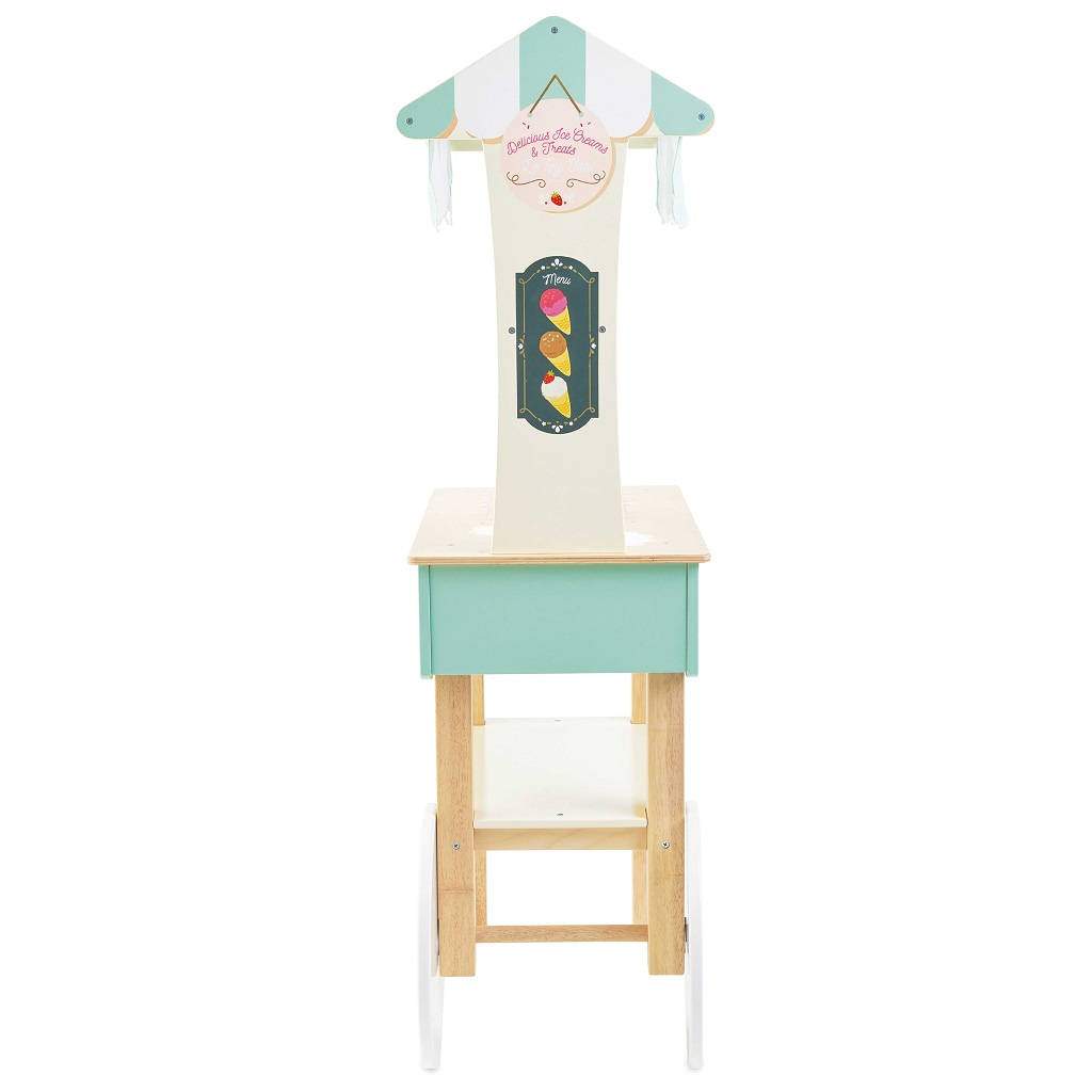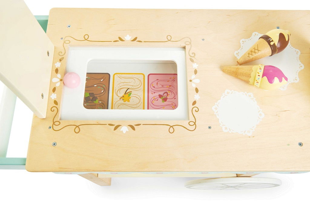 Letní občerstvení! Se stylovým zmrzlinovým vozíkem, který se v dnešní době vidí opravdu zřídkakdy, si děti mohou zahrát na zmrzlináře a zmrzlinářky. Retro zmrzlinový vozík je perfektní pro představivou hru v dětském pokoji i na zahradě. Klasický pruhovaný látkový baldachýn, pastelové barvy a zlaté detaily, tato skutečně jedinečná hračka je vyrobena z udržitelného dřeva a designována tak, aby vydržela mnoho let představivé hry. Má mnoho realistických funkcí, které mohou děti objevovat během hry. Přihrádku na led s posuvnými dveřmi, které odhalí ilustrace klasických příchutí zmrzliny, dva magnetické kornouty na zmrzlinu, pohyblivá kolečka, díky kterým budou moct zmrzlinu servírovat kdekoliv.