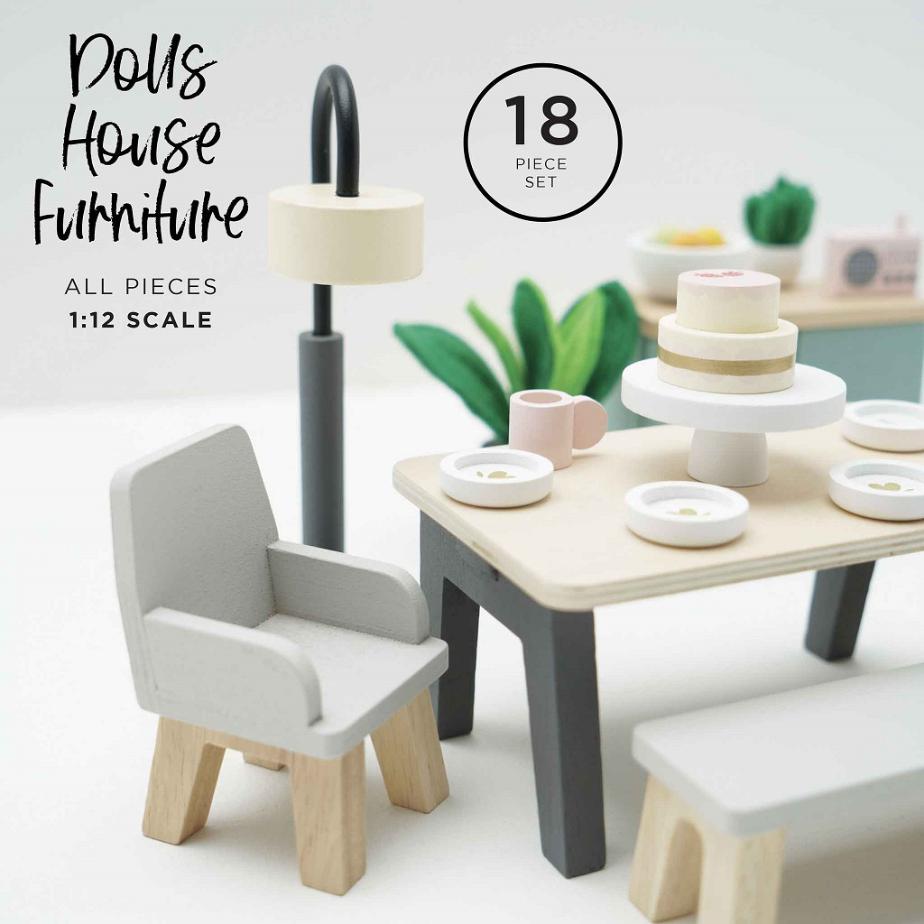 Pokochejte se tímto úžasným dětským jídelním setem s nádechem moderní elegance, který je dokonalým doplňkem do každého miniaturního domečku pro panenky. Stylová a udržitelná je tato 18dílná sada vyrobena z FSC ® certifikovaného dřeva. Dřevěný stůl se dvěma křesly a lavicí, doplňuje volně stojící lampa, příborník, 2 rostliny s realistickými plstěnými listy, mísa na ovoce s dřevěným ovocem, rádio, 4 jídelní talíře se dvěma hrníčky a také vynikající dort naaranžovaný na stojánku k pokušení malých hostů u večeře. Tato sada je kompatibilní s naší řadou úžasných domečků pro panenky.