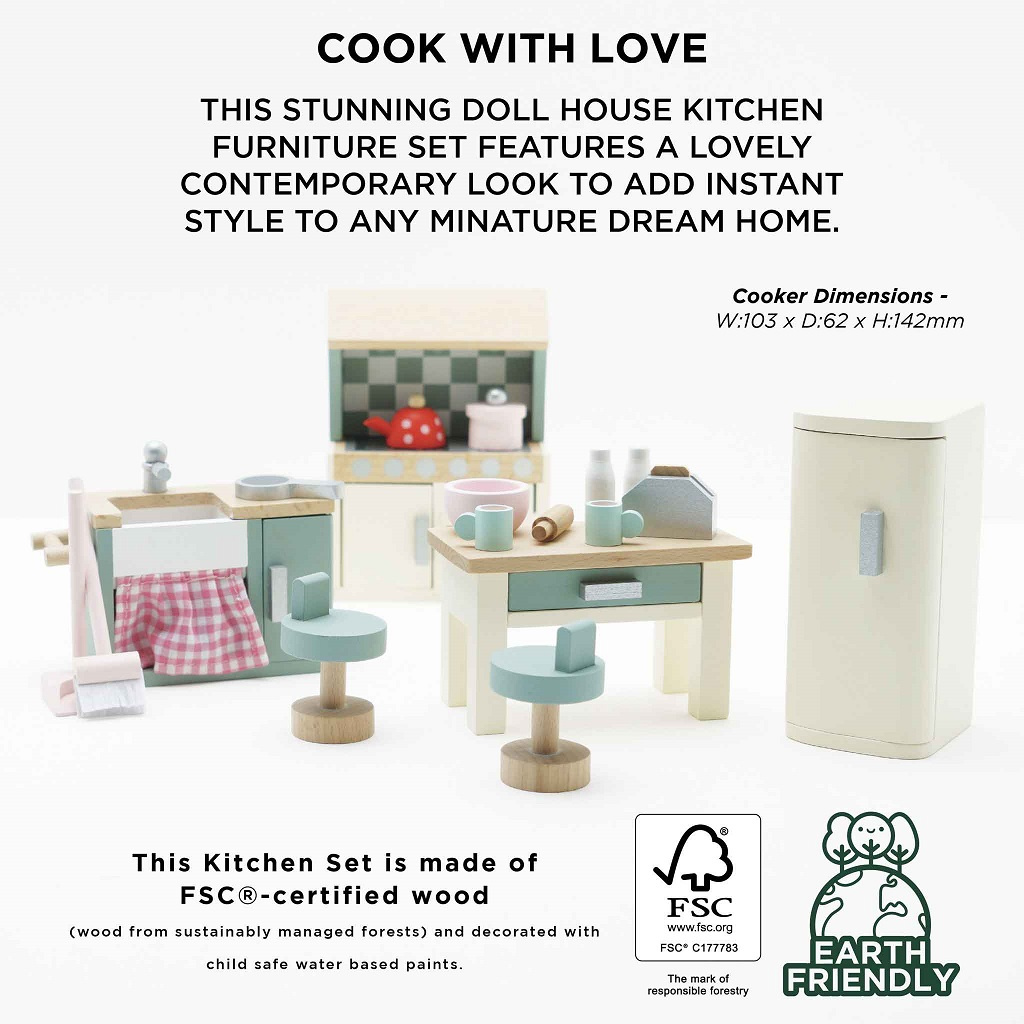 Žádný domeček pro panenky není kompletní bez vybavené kuchyně. S tímto krásným dřevěným setem do kuchyně mohou děti uvařit nebo upéct něco dobrého pro své miniaturní hosty. Tento představivý set s důrazem na detail se skládá z dřezu, sporáku, trouby s otevíratelnými dveřmi, velké lednice s otevíratelnými dveřmi, stolu s 2 židličkami, na kterém můžete krájet a připravovat.