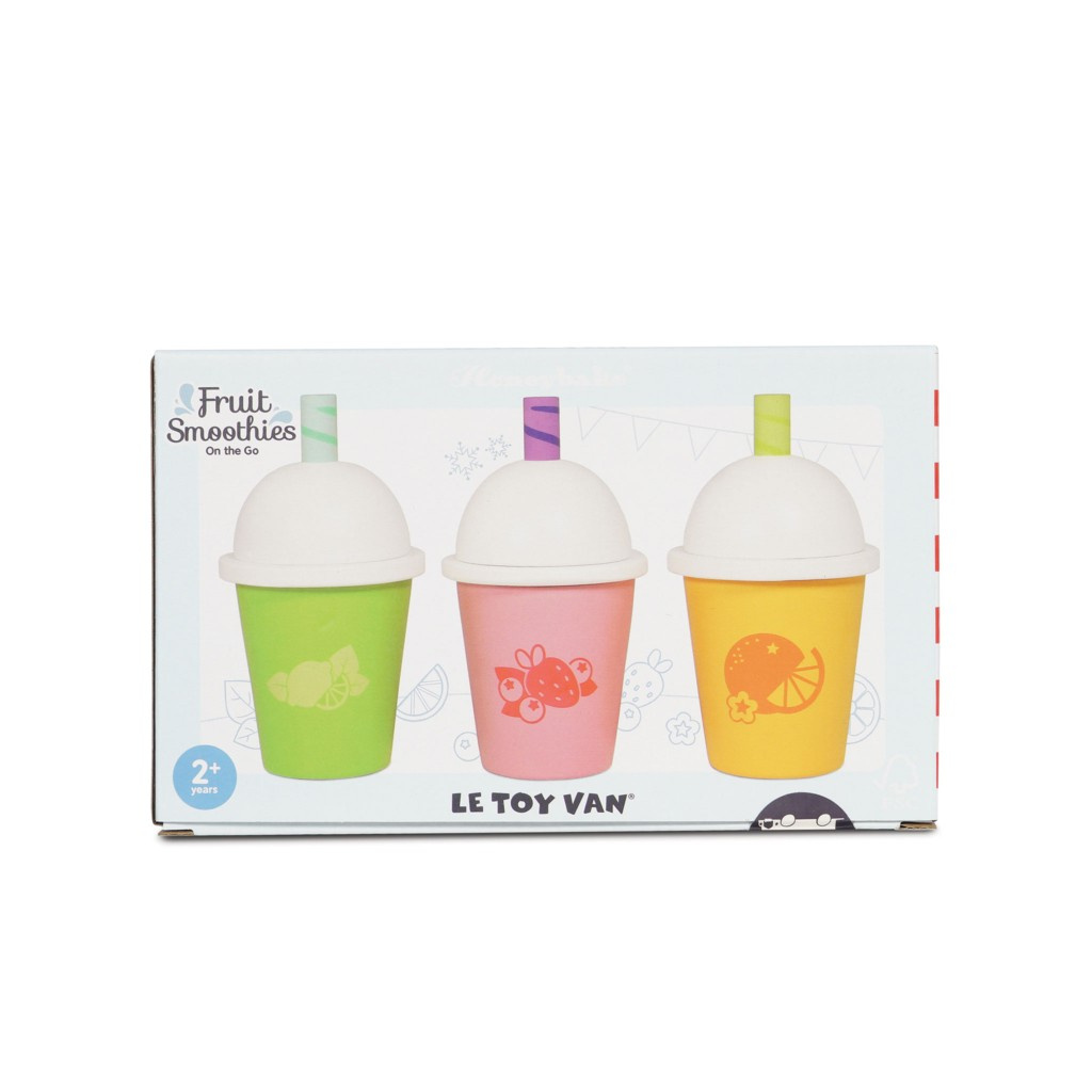 Chutné trio smoothies to-go, neboli s sebou. Tyto roztomilé ovocné koktejly jsou univerzální, budou se hodit do dětských kuchyněk i prodejních stánků, samozřejmě poslouží i samostatně. Paleta pestrých barev je na slámce doplněna o proužky, tato genderově neutrální hračka je vyrobena z pevného a udržitelného dřeva. Hodí se také k ostatním hračkám v tematice dětského tržního stánku a kuchyně, to vše pro bohatou hru plnou představivosti.