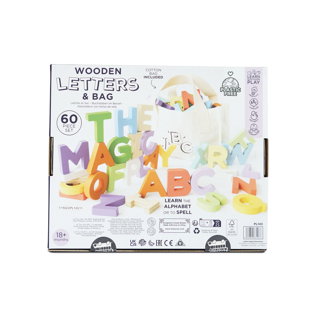 Vyhláskujte si cestu k úspěchu s touto krásnou sadou písmenek! 60 dílků duhových barev malým slovíčkářům pomáhají se naučit abecedu a utvářet jednoduchá slova. Sada obsahuje také plátěnou tašku, jenž slouží pro bezpečné uložení písmen na konci rušného hraní. Dílky jsou vyrobeny ze dřeva s certifikací FSC® (dřevo z lesů obhospodařovaných udržitelným způsobem) a ozdobeny barvami na vodní bázi bezpečnými pro děti.