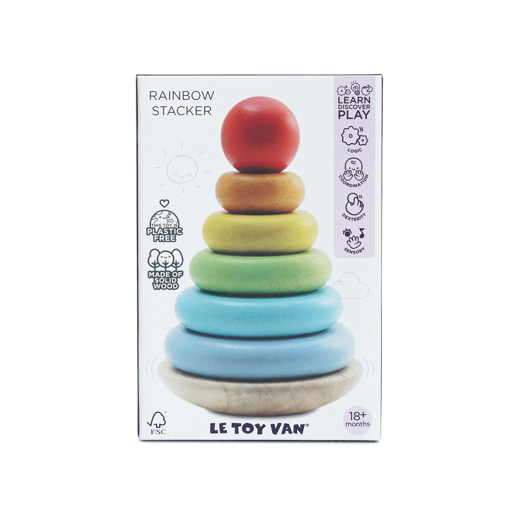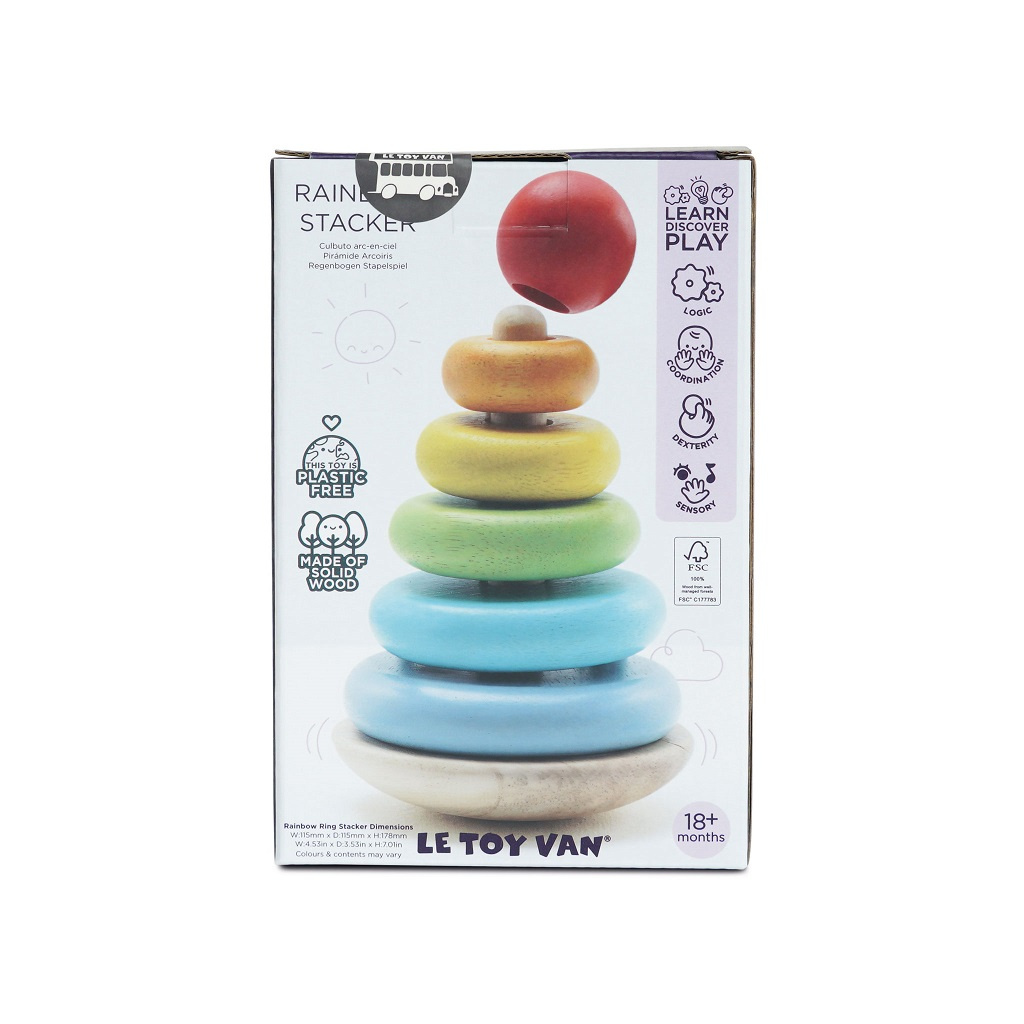 Dokážeš poskládat tuto duhu ve správném pořadí? Robustní barevné kroužky vybízí i ty nejmenší děti k jejich třídění. Trénuje se tak motorika, koordinace ruky a oka a chápání tvarů a velikostí. Houpající základna přidává na zábavě! Skládací věž je vyrobena ze dřeva s certifikací FSC® (dřevo z lesů obhospodařovaných udržitelným způsobem) a ozdobena barvami na vodní bázi bezpečnými pro děti.