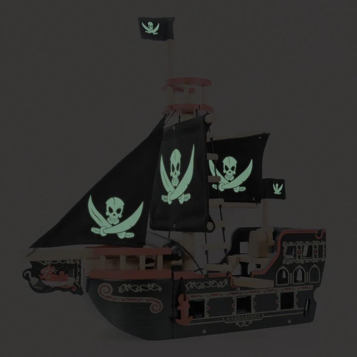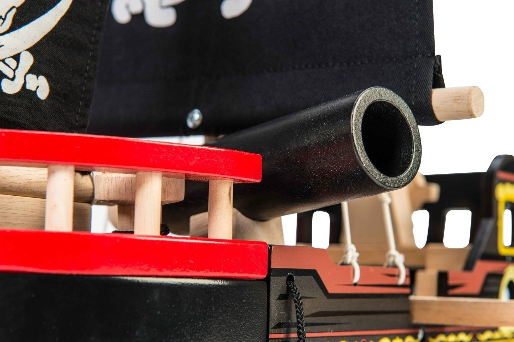 Velkolepá Barbarossa je připravena k plavbě! Loď je malována černou barvou, její černé plachty s lebkou a překříženými meči varují, piráti se plaví! Krásná hračka s mnoha detaily je vyrobena z odolného a udržitelného dřeva. Je plná interaktivních funkcí, které děti mohou objevovat během představivé hry – vraní hnízdo, popravčí prkno, lanoví, dělo s koulemi (střílí díky pružiny), kotva s navijákem, dveře do podpalubí a otevírací záď. Hračka bez obsahu plastu je vhodná pro figurky do 10 cm.