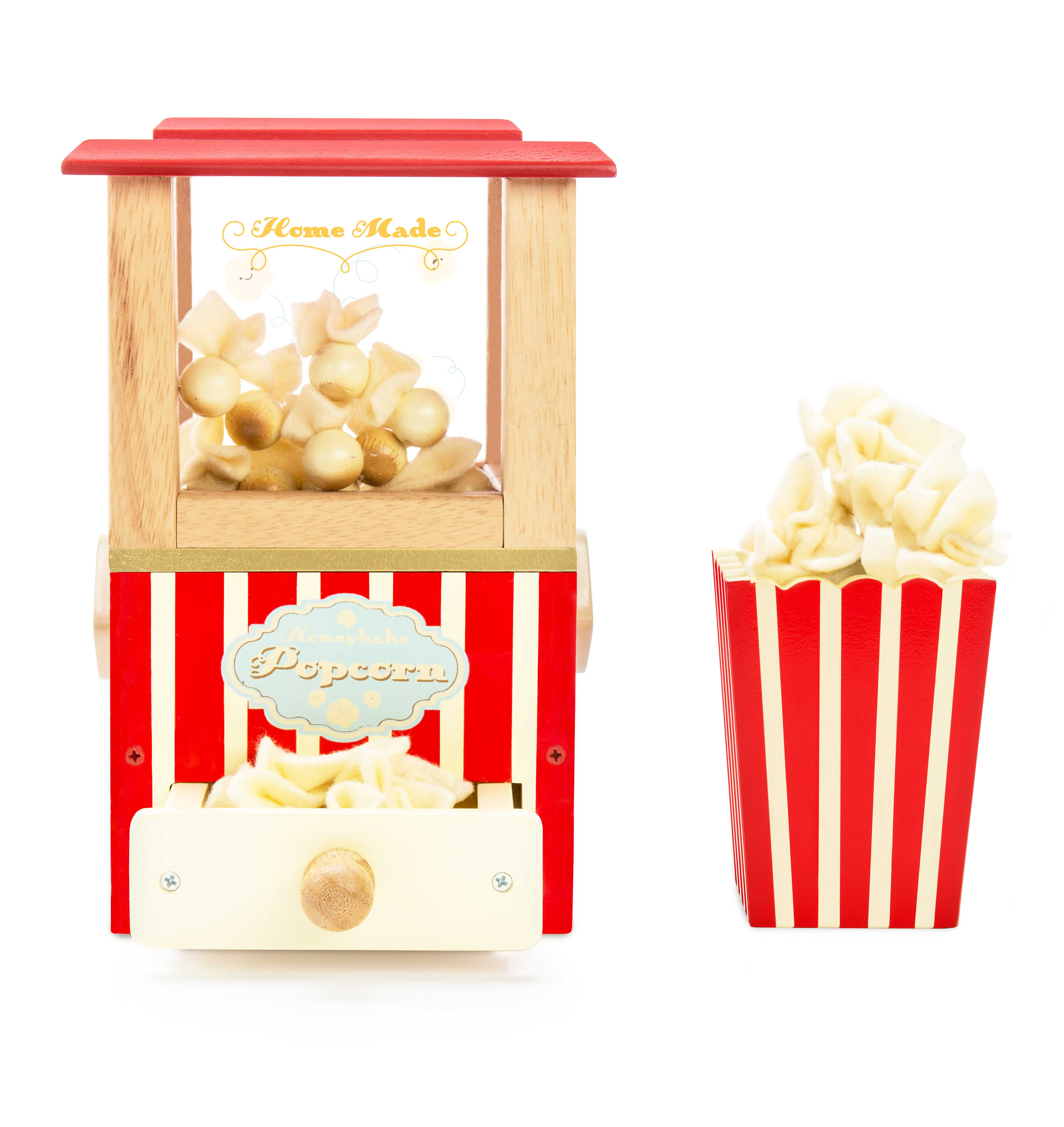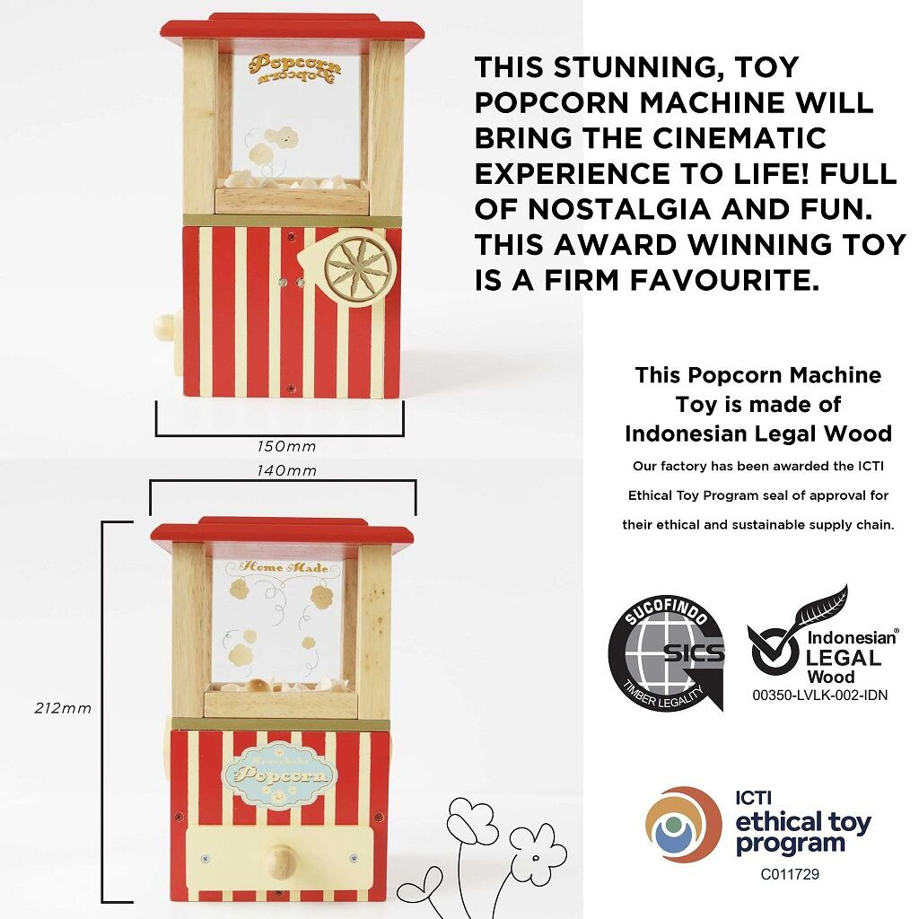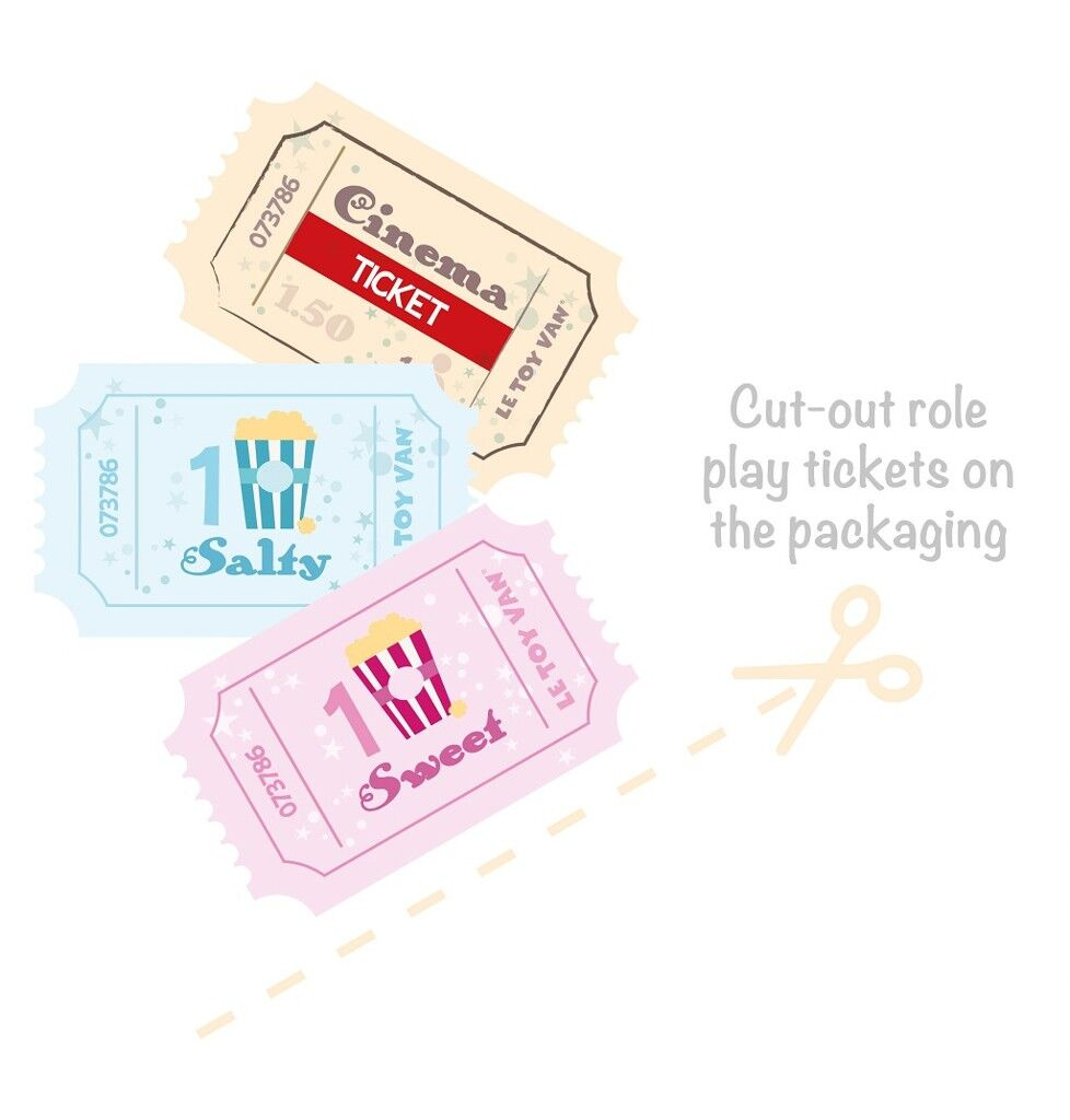 Čas na film a popkorn! Nostalgie a zábava, tato hračka nabídne obojí. Designováno talentovanými hračkáři, vyrobeno z udržitelného dřeva, bude se vyjímat v každém dětském pokoji. Vintage červená s krémovými proužky a přírodní dřevo rozproudí dětskou představivost. Použijte páčku pro „pukání popkornu“, 5 plstěných popkornů pak můžete vyjmout z šuplíku a vložit do veselé krabičky na popkorn. Ideální hračka pro trénink jemné motoriky a sociálních dovedností, pomůže také s rozvojem řeči. V balení najdete lístky do kina, lístky na sladký/slaný popkorn, které představivou hru ještě pozvednou.