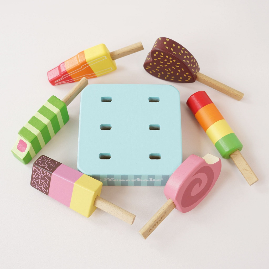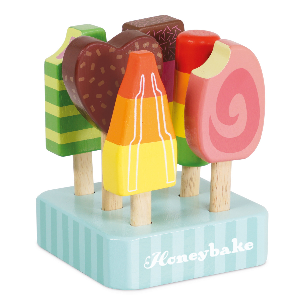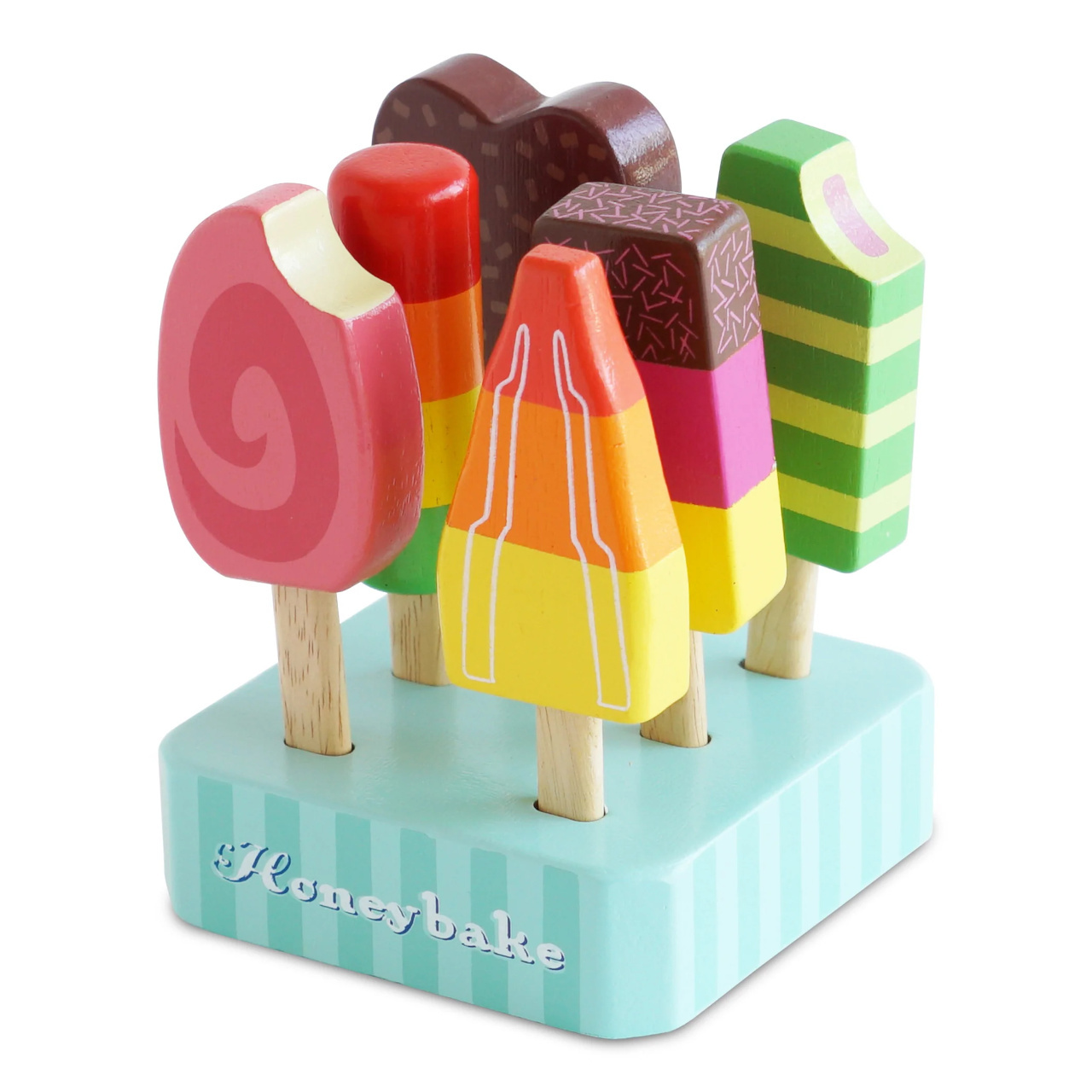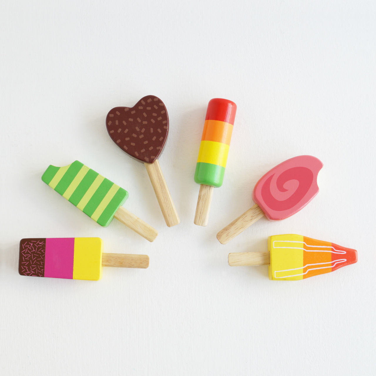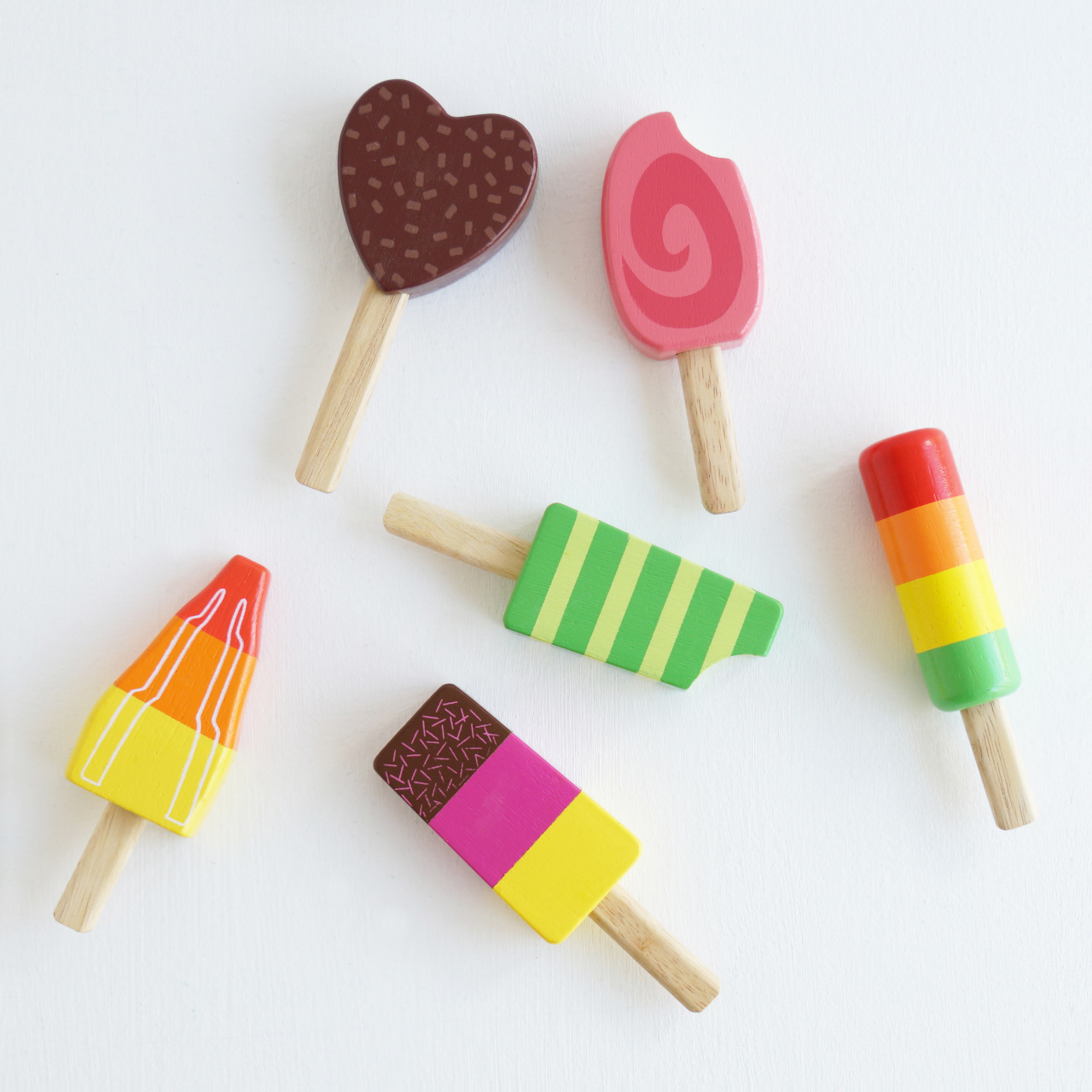 Sada šesti ručně malovaných nanuků je perfektní pro představivou hru. Odolná hračka z pevného kaučukového dřeva, které nechybí ani dřevěný stojan, v kterém lze nanuky servírovat. Čokoládové, ovocné i smetanové, každý z nich má vlastní realistický design plný detailů. Představivá hračka dětem pomůže s rozvojem jemné motoriky, také je podpoří v kreativní hře. Ideální dolpněk prodejního nebo zmrzlinového stánku.