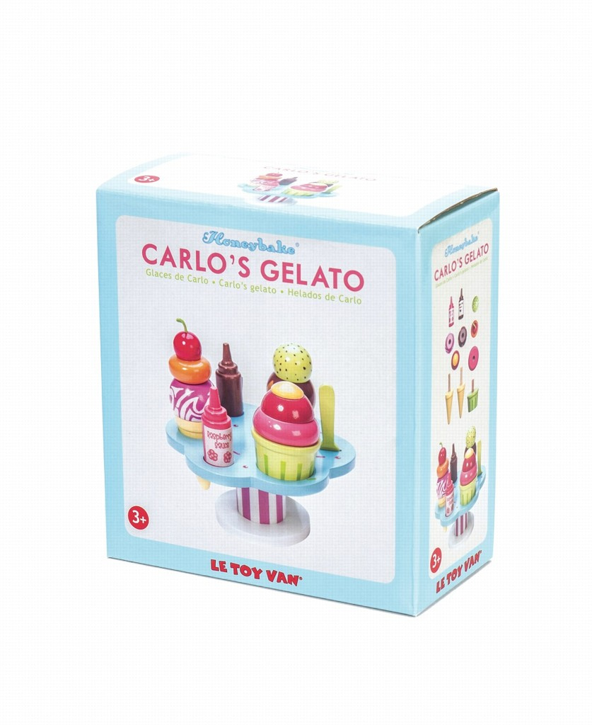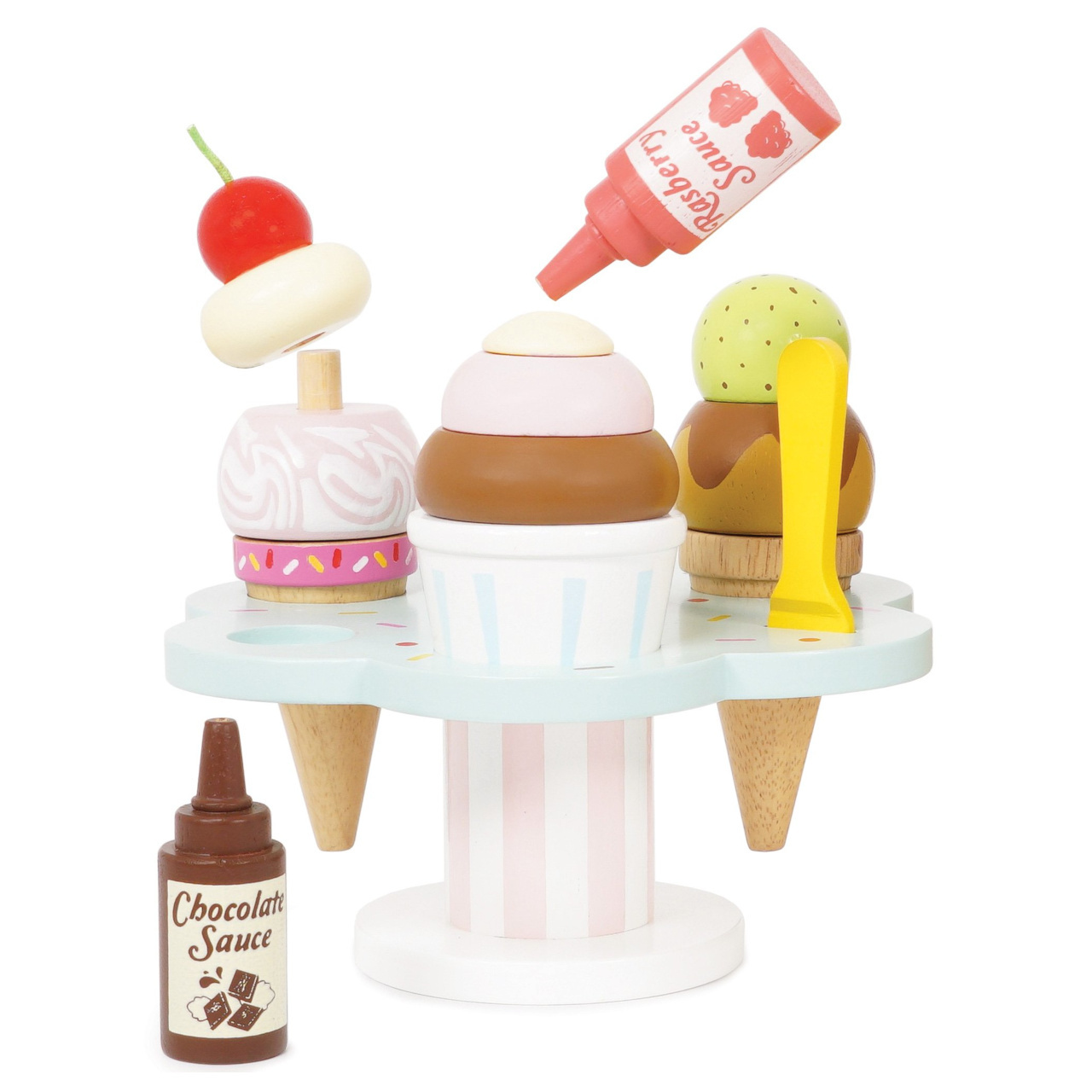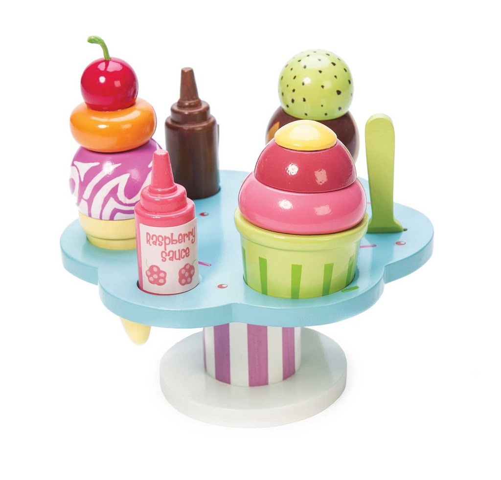 Kopeček nebo dva? Děti si s touto představivou hračkou na role užijí mnoho zábavy. Děti mohou zmrzlinu servírovat v kelímku nebo kornoutku, lze vybrat ze dvou topingů i posypek, nechybí ani lžička. Perfektní hračka nejen pro teplé letní měsíce. Vyrobeno z odolného a udržitelného FSC® dřeva, malováno netoxickými barvami na bázi vody.