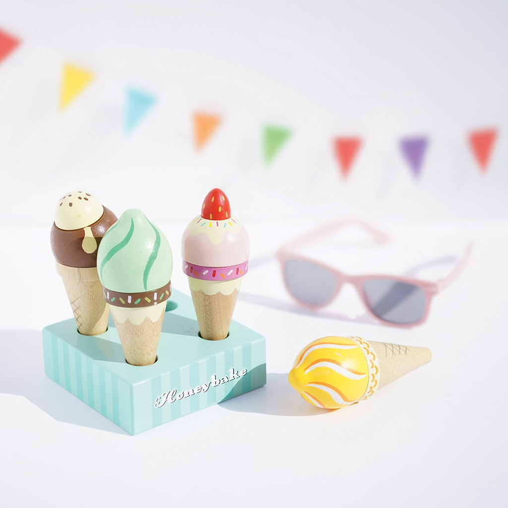 Jednu čokoládovou! S touto sladkou sadou čtyř ručně malovaných kornoutů zmrzliny budou děti moci servírovat osvěžení při představivé hře. Krásně zdobené kornouty zmrzliny jsou vyrobeny z masivního kaučukového dřeva, malovány realisticky s rozdílnými detaily a jsou doplněny o robustní dřevěný stojan. Při hře si děti procvičí koordinaci ruka-oko a jemnou motoriku.