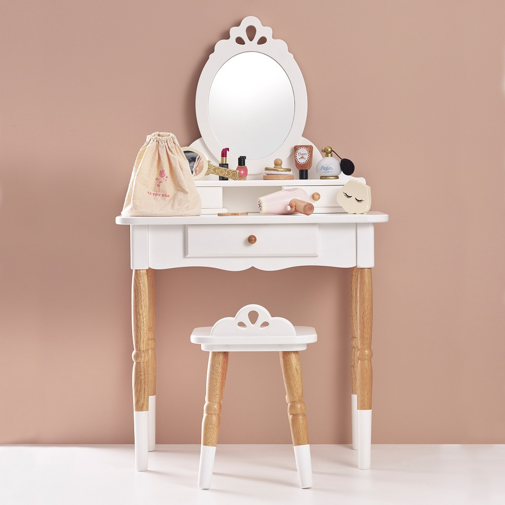 Krásný toaletní stolek v retro stylu, jistě naplní sny nejednoho dítěte. Bude se vyjímat v dětském pokoji nebo herně, je velmi elegantní a při hře opravdu upoutá pozornost dětí. Viktoriánské oválné zrcadlo z prvotřídního, nerozbitného akrylátu, dvoupatrový stolek, 3 šuplíky – perfektní pro skrytí pokladů a cetek. Vyrobeno týmem talentovaných hračkářů za použití udržitelného kaučukového dřeva, krásný kousek je vyroben s důrazem na detaily. Stůl i židle mají nohy zajímavého tvaru. Kombinace bílé a přírodního dřeva pro nadčasový vzhled. Krásný nábytek si můžete předávat z generace na generaci.