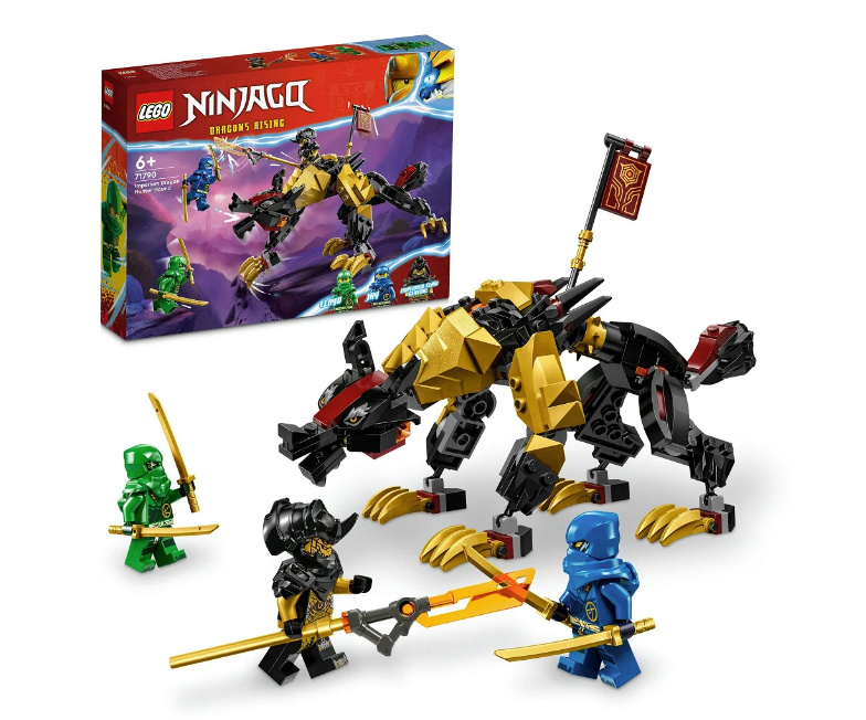 V této stavebnici LEGO® NINJAGO najdete 3 minifigurky: nindža bojovníky Lloyda a Jaye se 2 katanami a císařského generála s velkým mečem, který si může osedlat příšeru jménem Photac.