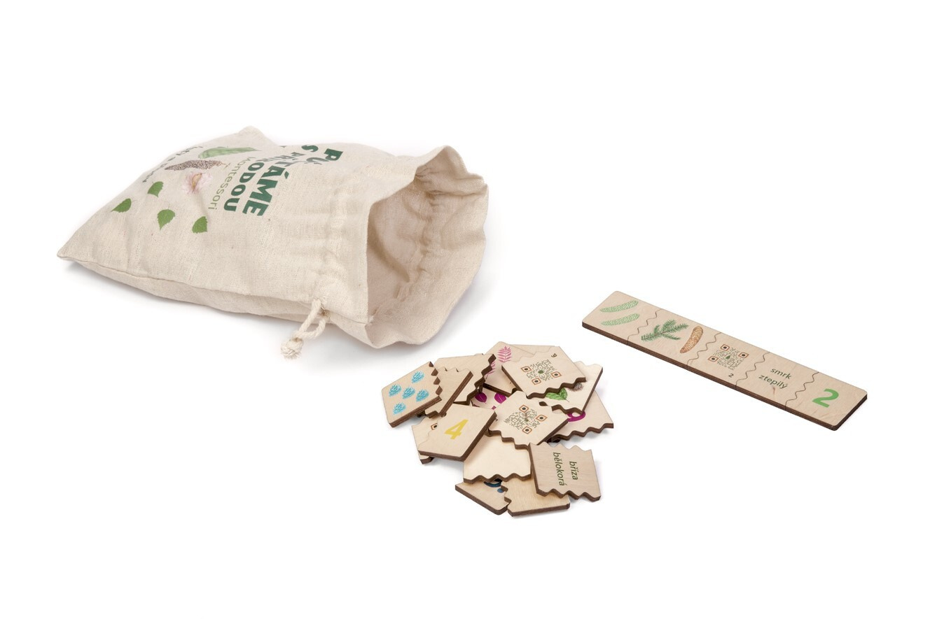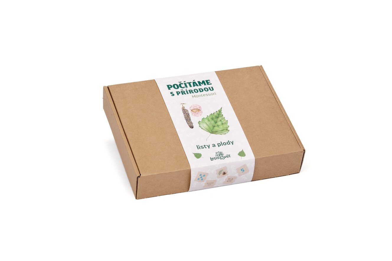 Lesní svět – Počítáme s přírodou Montessori: Listy a plody je edukativní hra, která zábavnou formou učí poznávat přírodu, počítat a přiřazovat jednotlivé dílky. Balení obsahuje 50 dílků (10 sestav) a návod. Každá sestava se skládá z pěti dílků: reálného obrázku listu a plodu, siluety listu nebo plodu, číslice, názvu a QR kódu. Číslice jsou barevně kódované podle principů Montessori výuky. Dílky jsou zabaleny v přírodním látkovém pytlíku s potiskem.