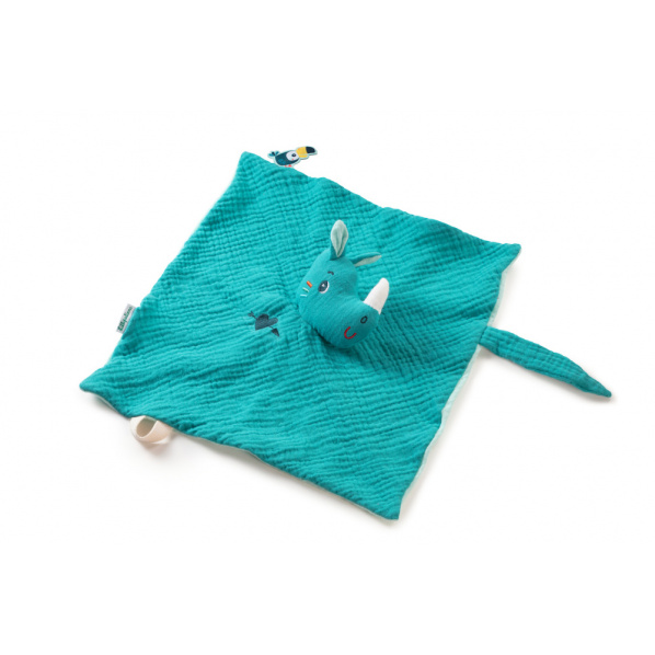 Měkoučký muchláček nosorožec Marius je ideální hračka do postýlky pro děti již od narození. Měkký dotek a postavička kamaráda nosorožce bude děti uklidňovat při usínání. Navíc si lze s nosorožcem hrát jako s loutkou a starším dětem tak můžete vyprávět příběhy. Lze využít i jako držák na dudlík. Rozměry muchláčka jsou 32 x 32 cm. Lze prát v pračce na jemný cyklus při 30°C. Vyrobeno z organické bavlny. Výplň je ze 100% polyesteru.