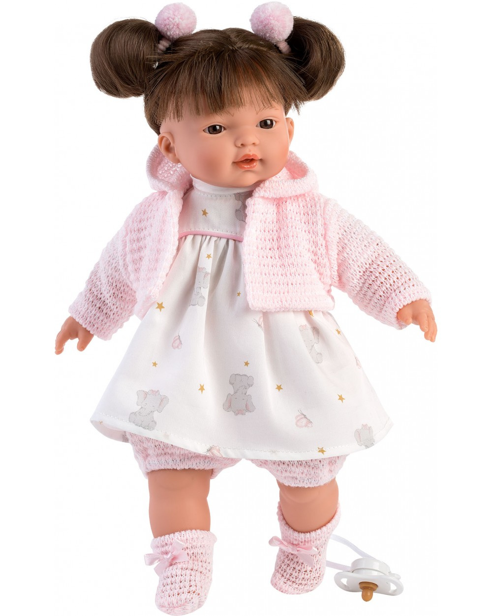 Mluvící panenka s měkkým látkovým tělem a s vlásky po celé hlavě. Po vytažení dudlíku z úst začne panenka říkat „mama“, „papa“ a vydávat reálný zvuk plačícího miminka. Panenku lze utišit dudlíkem. Velikost 33 cm. Součástí balení je 3 x knoflíková baterie LR44.