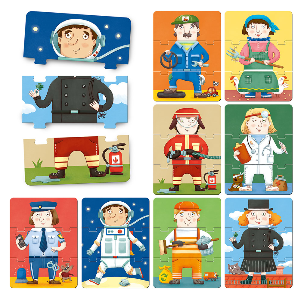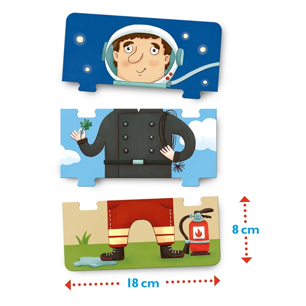 Astronaut se sukní a hasičskou helmou? Kominík s pouty a lékařským pláštěm? Nebo vám lépe vyhovuje údržbářská kombinéza? Části třídílných skládaček lze mezi sebou libovolně zaměňovat. S extra velkými dílky si mohou malí milovníci puzzle snadno vymýšlet své vlastní bláznivé práce. Hlavolam u dětí hravou formou procvičí koncentraci a kreativitu, dále se také naučí něco o zaměstnání.