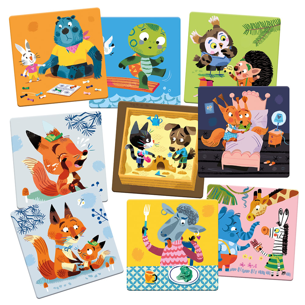 Které pocity k sobě patří? Tato hra na procvičení paměti s extra velkými kartami zve děti, aby mluvily o svých pocitech a rozpoznávaly a chápaly každodenní situace. Osm dvojic obrázků zobrazují dětskou radost, strach a starosti pomocí moderních zvířecích ilustrací polské umělkyně Ely Smietenky.