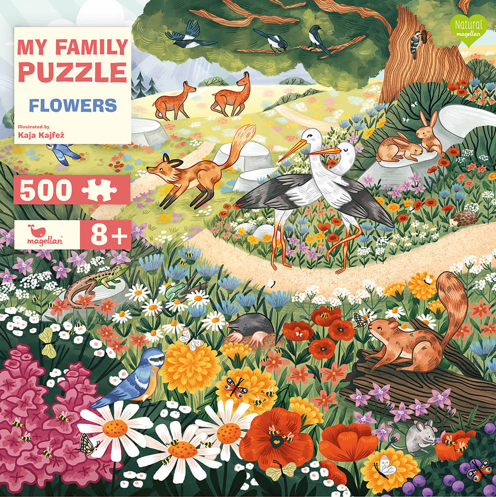 Sestavte všech 500 dílků a buďte svědky okouzlujícího pohledu na rozkvetlou louku! Ponořte se do barevného moře květin a objevujte zvířata, která mezi nimi žijí! Puzzle hravou formou trénuje koncentraci a jemnou motoriku a nabízí vzrušující zábavu pro děti od 8 let i celou rodinu.