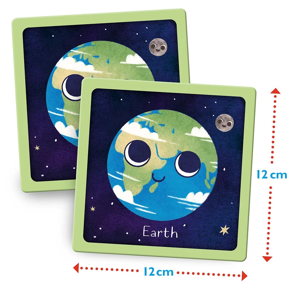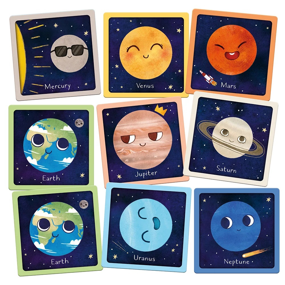 Která planeta je nejblíže Slunci? A jak se jmenuje ta s prstenci? Vzleťme mezi hvězdy a pojďme to zjistit! V této krásné ilustrované hře mohou malí i velcí vesmírní milovníci nejen soutěžit o nejlepší paměť, ale také si procvičit pořadí a názvy planet ve sluneční soustavě. S extra velkými kartami lze kombinovat zábavu s předáváním znalostí a hravou formou trénovat paměť.