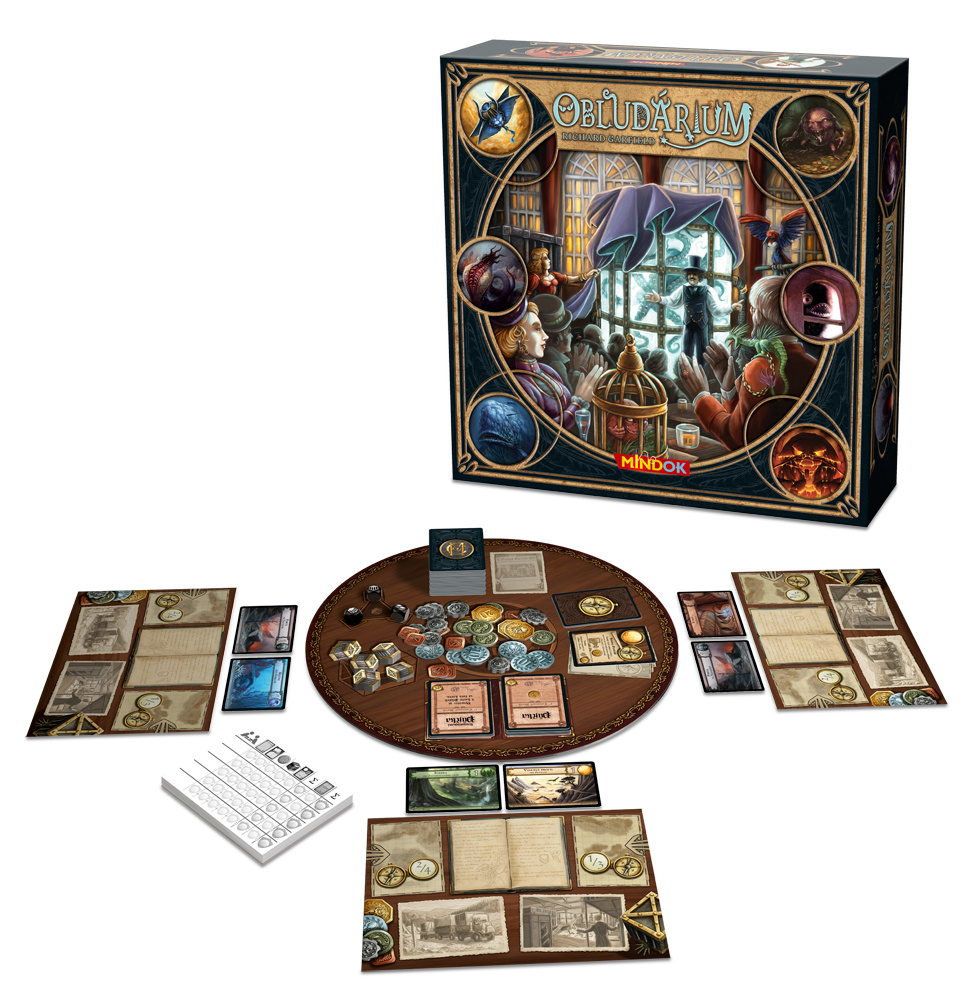 Obsah balení: 240 karet, 108 kartónových mincí, 24 žetonů lovců, 5 desek hráčů, kostky lovčích, 1 herní plán, česká pravidla hry