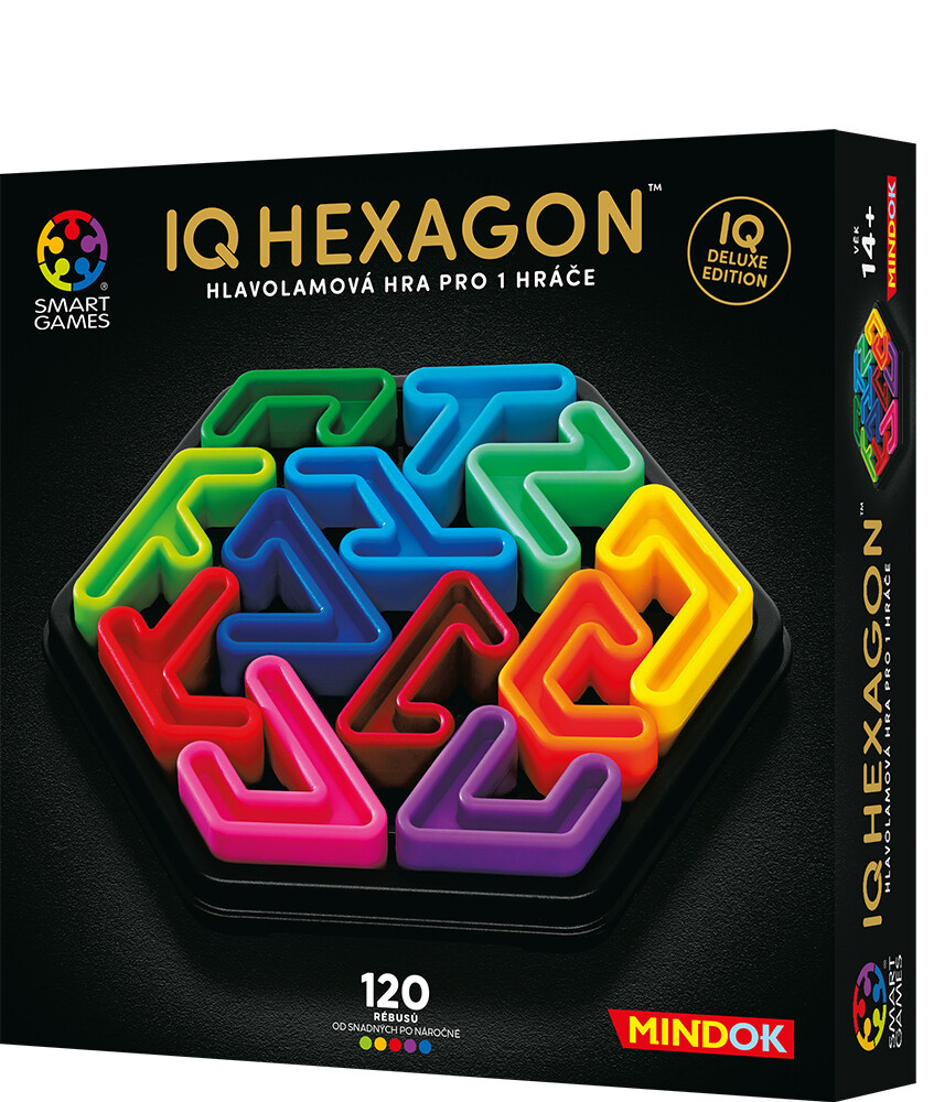 Připravte se na další chytrý hlavolam ze série IQ! Hra IQ Hexagon vás zavede do světa šestiúhelníkových dílků, které musíte umístit na hrací desku. V knížce zadání si vyberte jednu z úloh, kde je uvedena startovní pozice některých dílků – umístěte je na desku přesně podle zadání.