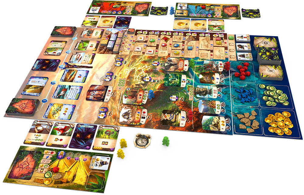 Obsah balení: 1 oboustranný herní plán, 4 oboustranné hráčské desky, 1 oboustranný plán zásob, 110 karet, 8 dřevěných figurek archeologů, 8 dřevěných žetonů bádání, 16 destiček lokalit, 16 žetonů sošek, 15 destiček strážců, 12 destiček pomocníků, 18 žetonů objevů, 24 žetonů legend, 5 blokovacích žetonů, 15 destiček akcí protihráče (pro sólovou hru), 27 žetonů mincí, 27 žetonů kompasů, 12 plastových hrotů, 9 plastových drahokamů, 16 plastových tabulek, 10 žetonů rezerv, 1 žeton začínajícího hráče, 1 měsíční hůl, 1 bodovací zápisník, 4 přehledové listy, pravidla hry