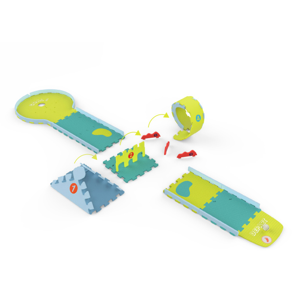 Pěnové puzzle, z něhož lze snadno poskládat golfovou dráhu. Puzzle lze poskládat do tří různých golfových drah, které jsou vyobrazeny na obrázku krabice, ale fantazii se meze nekladou a můžete si vytvořit i své vlastní golfové dráhy.