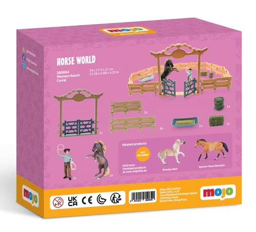 Představujeme vám Mojo Westernový ranč Corral s koněm a kovbojem - hračku, která vaše děti přenese přímo do srdce nekonečných plání a závratných dobrodružství. Připravte se na cestu, která rozšíří obzory fantazie vašich dětí a přinese domů kus ikonického západu. Vyrobeno s láskou a pozorností k detailu zkušenými řemeslníky ve Velké Británii. Každá figurka, od majestátního koně po statečného kovboje, je pečlivě modelována tak, aby odrážela jejich skutečné protějšky s úchvatnou přesností. Jejich prvotřídní polyvinylchloridová konstrukce zaručuje, že vaše dobrodružství bude trvat dlouho a bezpečně.