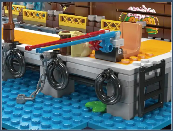 Model je detailně propracovaný a sestavíte jej z 842 kvalitních dílků. Každé patro hostince je oddělitelné, takže snadno nahlédnete do interiéru plného námořnické výbavy a dobového vybavení. Stavba stojí na modré základové desce, která připomíná vodní hladinu, a na dřevěném molu připraveném pro zakotvení lodí.