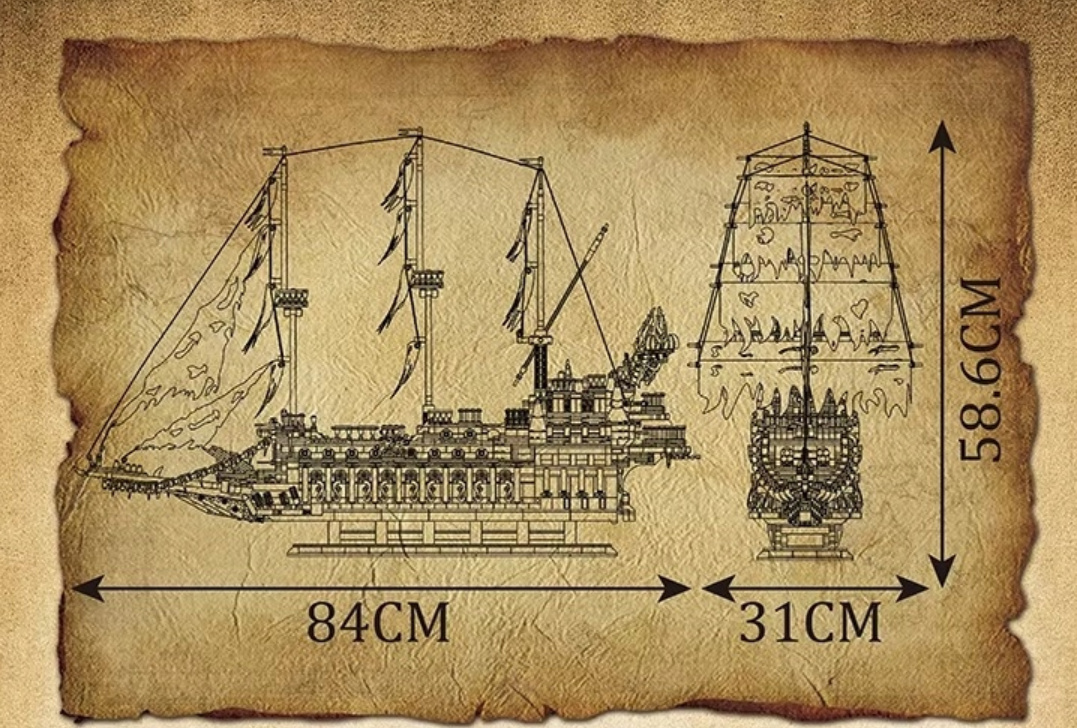 Loď sestavíte z 4 364 kostek podle podrobného návodu. Výsledkem je impozantní plachetnice dlouhá 84 cm, vysoká 58,6 cm a široká 31 cm. Každý detail je promyšlený do posledního kousku – od potrhaných plachet a strážních věží po kormidlo, děla a balkonovou záď. Díky realistickému designu a charakteristické atmosféře působí loď jako skutečný přízrak moří.