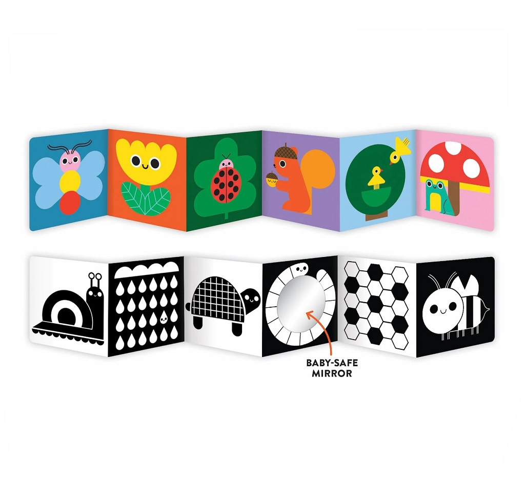 Užijte si čas se svým miminkem na maximum. Vaše děťátko si zamiluje krásné obrázky v této oboustranné knížce, ale také zrcátko, do kterého se může na sebe dívat. Otevřená knížka může stát na koberci, v posteli nebo v postýlce, takže je dokonalým doplňkem pro chvíle strávené ležením na bříšku. Zrcátko je bezpečné pro děti.