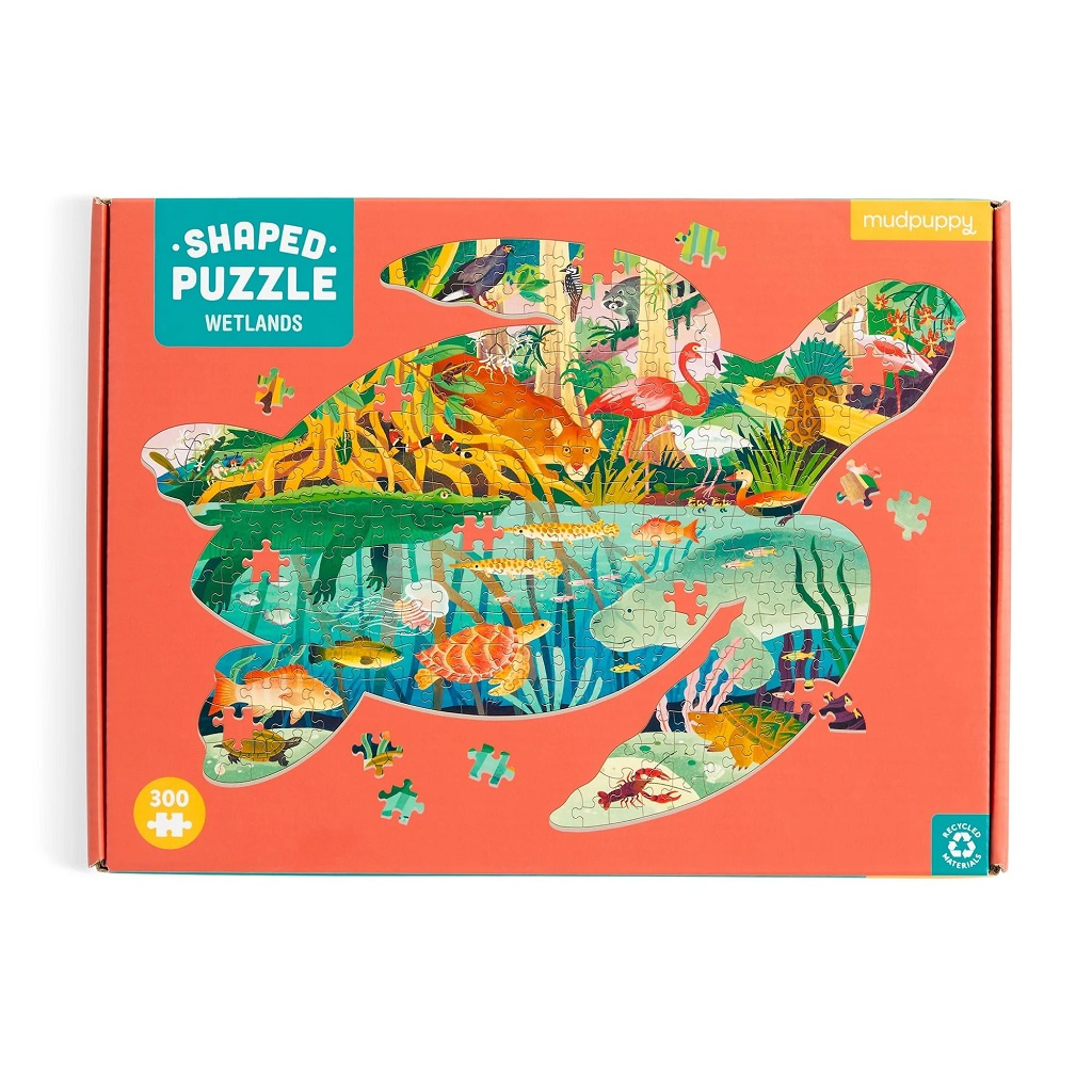 Puzzle Mokřady ve tvaru želvy od Mudpuppy obsahuje 300 dílků a má jasnou a barevnou scénu vašich oblíbených zvířat nalezených v mokřadech, včetně aligátora, pantera, vážek a mnoha dalších. Hotové puzzle má tvar želvy. Puzzle je baleno v pevné krabici, pro opětovné použití a skladování. Ideální jako dárek. Autor obrázku je Kaley McKean.