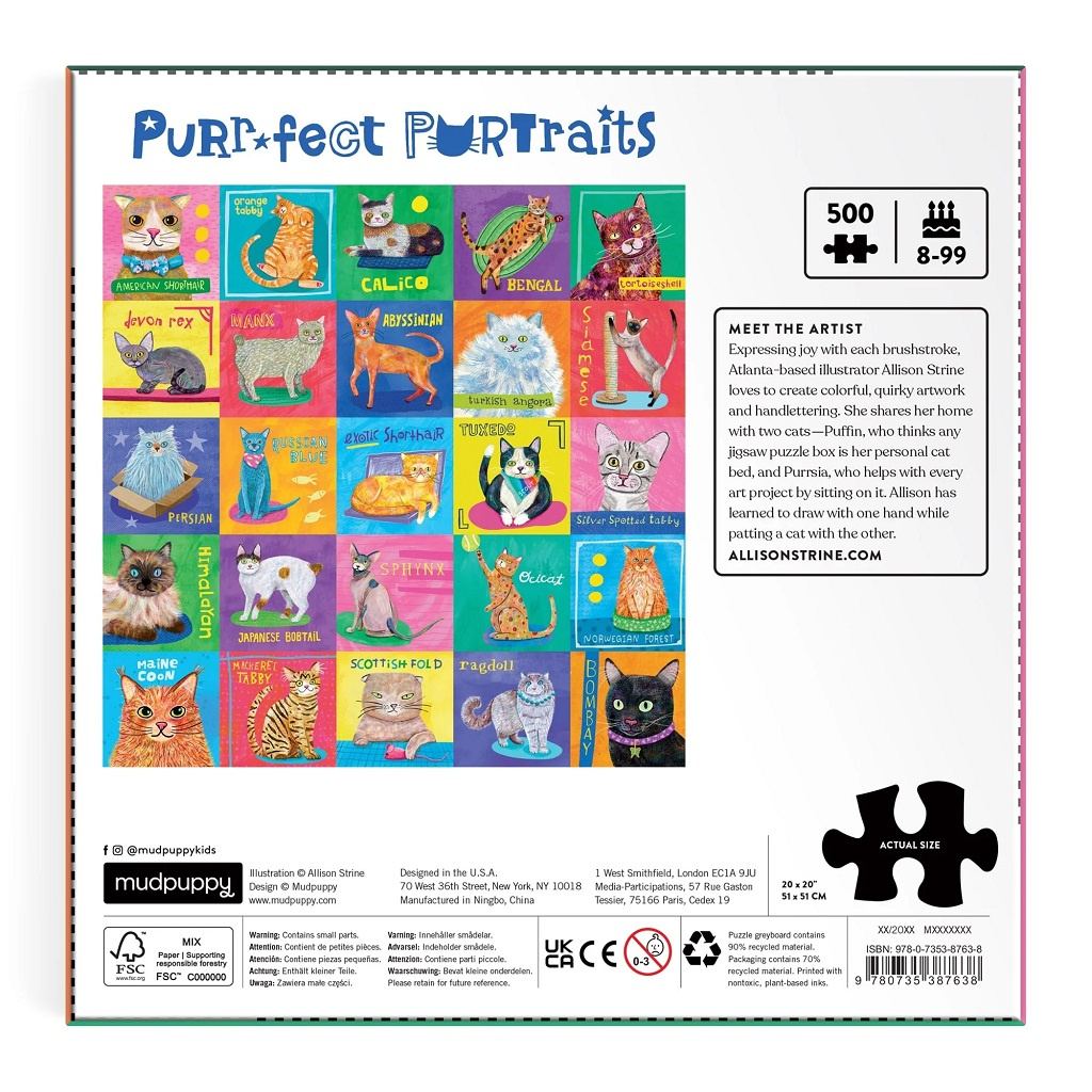 Puzzle s kočičími portréty od značky Mudpuppy obsahují 500 dílků a představují pestrou směs různých kočičích plemen s jejich oficiálními názvy. Puzzle má ideální obtížnost, aby si ho mohla užít celá rodina. V balení najdete plakát s celým obrázkem pro snadnější skládání. Perfektní dárek pro každého malého milovníka koček! Puzzle je vyrobeno z pevného kartonu, má krásně syté barvy, které zaujmou dětské oči, a podporuje hraní bez obrazovek. Pomáhá rozvíjet logické myšlení, prostorovou představivost i koordinaci ruka-oko.