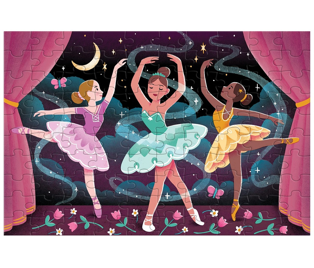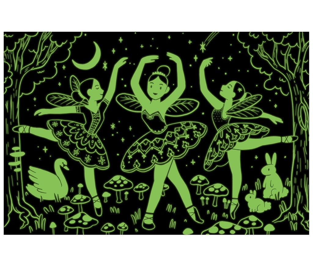 Složte dohromady taneční scénu přímo z Labutího jezera! Zhasněte světla a buďte svědky magie! Toto 100dílné puzzle obsahuje poutavé dílo elegantních tanečnic, jenž se za tmy proměňují ve víly na kouzelném paloučku!