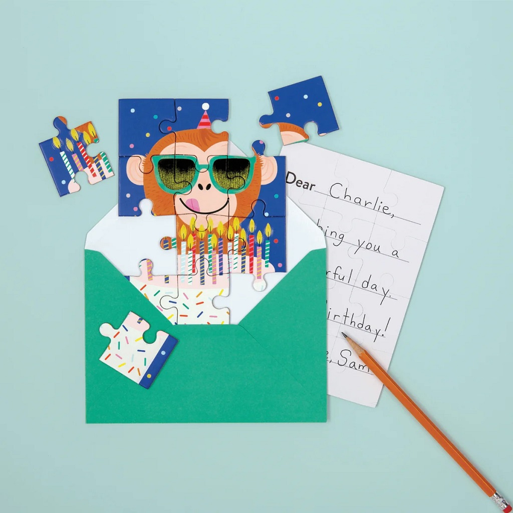 Puzzle s přáním od Mudpuppy obsahuje 12 dílků s obrázkem barevných kočiček na jedné straně a prostorem pro přání na druhé straně. Na zadní stranu složeného puzzle můžete napsat zprávu, dílky rozdělit, vložit do přiložené obálky a poslat poštou.
