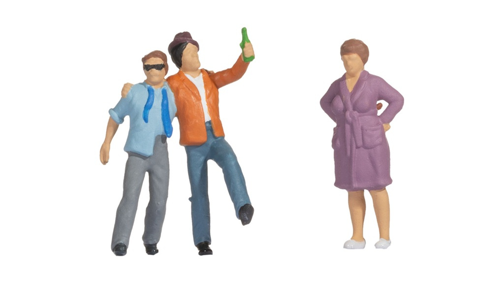 Sada figurek Veselí kamarádi přináší na vaši modelovou železnici zábavnou a velmi realistickou scénku. Dva dobří kamarádi si zjevně užili příjemný večer a teď se v dobré náladě, ruku v ruce a s lahví v ruce, vracejí domů. Na jejich návrat už ale čeká třetí postava – rázná paní v županu se založenýma rukama a přísným pohledem. Je zřejmé, že z jejich nočního výletu není zrovna nadšená.