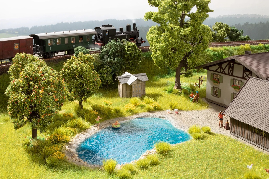 Tvorba vodních ploch patří mezi nejnáročnější úkoly při stavbě modelové krajiny. Pro co nejsnazší a nejrychlejší dosažení realistického výsledku bylo vyvinuto speciální modelové vodní médium, které představuje jednoduchý způsob, jak vytvořit jezero, rybník nebo mělký potok bez sklonu terénu. Tento materiál je ideální pro klidné a mělké vodní plochy, jako jsou pískovny, tůně nebo říční ramena. Skvěle poslouží také při modelování zahradních jezírek, kaluží či bažin. Jednosložkový materiál se nemusí míchat, stačí jej nalít přímo z lahve do připraveného koryta či dna vodní plochy. Díky jednoduché aplikaci je vhodný i pro začátečníky. Při práci je třeba počítat s tím, že materiál je založen na skutečné vodě a při zasychání výrazně ztrácí na objemu – smršťuje se přibližně o 50 %. Maximální doporučená výška pro jednorázové lití je 2–3 mm, výsledná výška po zaschnutí činí přibližně 1–1,5 mm.