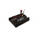 Součástí podložky jsou také praktické přihrádky na štětec, olejničku, drobné nářadí i malé součástky. Jedna z přihrádek je vybavena magnetickým proužkem, který bezpečně udrží miniaturní šroubky a zabrání jejich ztrátě.