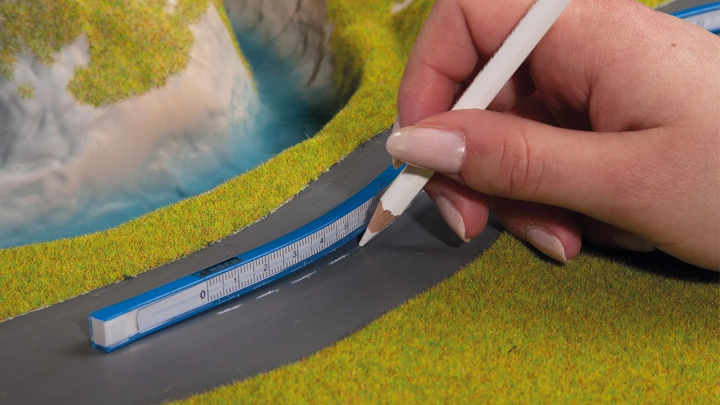 Kompletní řešení pro tvorbu dopravního značení na modelových silnicích. Startovací sada obsahuje vše potřebné pro snadné a přesné vytváření středových pruhů i krajních linií vozovky. Díky přiloženému ohebnému křivítku je možné bez obtíží značit i v zatáčkách. Speciální popisovač na značení silnic je ideální pro použití jak se šablonou, tak i s ohebným křivítkem. Součástí sady je také ukázková šablona pro rozchody H0, TT a N. Širší nabídka šablon s různými dopravními symboly, jako jsou směrové šipky, přechody pro chodce, parkovací místa a mnoho dalších značek, je k dispozici samostatně pro každou měřítkovou řadu. Speciální popisovače lze dokoupit jako příslušenství ve výhodném balení po třech kusech.